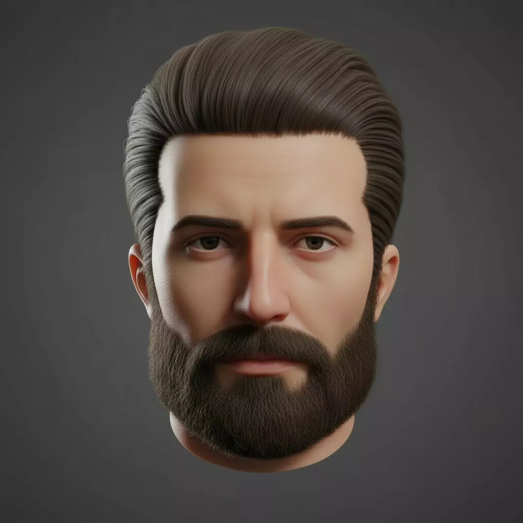 A highly detailed realistic male head 3D model designed specifically for 3D printing and premium visual projects.The model features a modern luxury barber hairstyle with smooth hair flow, clean hairline, and a full well-groomed beard. Facial anatomy is carefully sculpted with natural proportions, making it ideal for high-quality prints, character statues, barber shop displays, male grooming advertisements, and collectible figures.