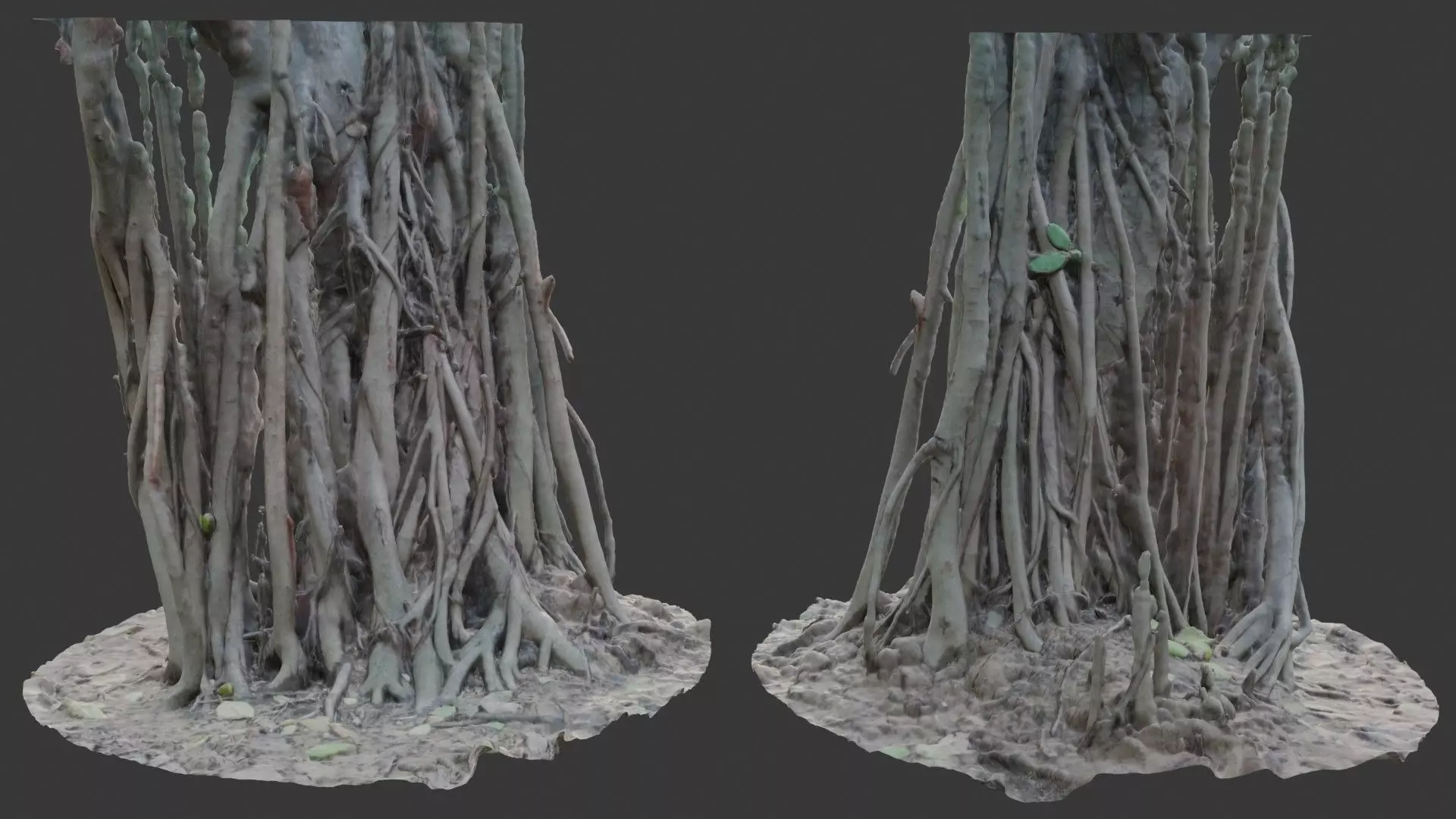 Highly detailed 3D scan of a dense, interwoven root base characteristic of banyan or mangrove trees, emerging dramatically from damp, muddy ground. This complex organic structure provides exceptional realism for swampy terrain, coastal environments, jungle scenes, or any setting needing a striking natural centerpiece.