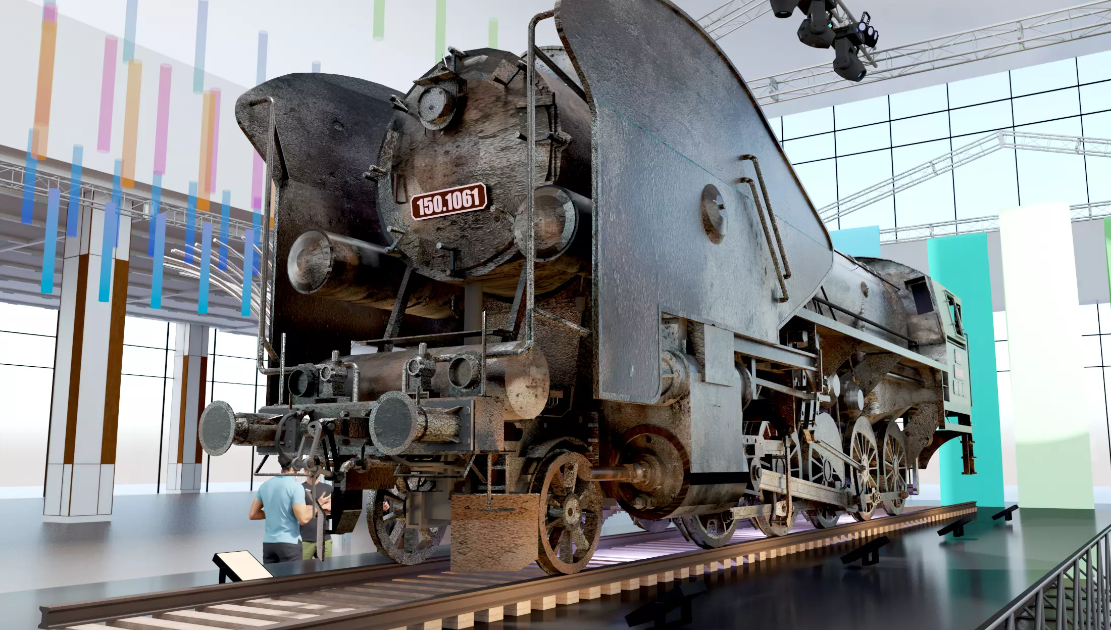 The exhibition booth design presents an artistic and nostalgic atmosphere, centered on honoring historical value through the centerpiece of a vintage steam locomotive. The locomotive is displayed prominently atop a robust steel truss system, creating a compelling contrast between the raw, weathered texture of the antique machinery and the modern exhibition environment.