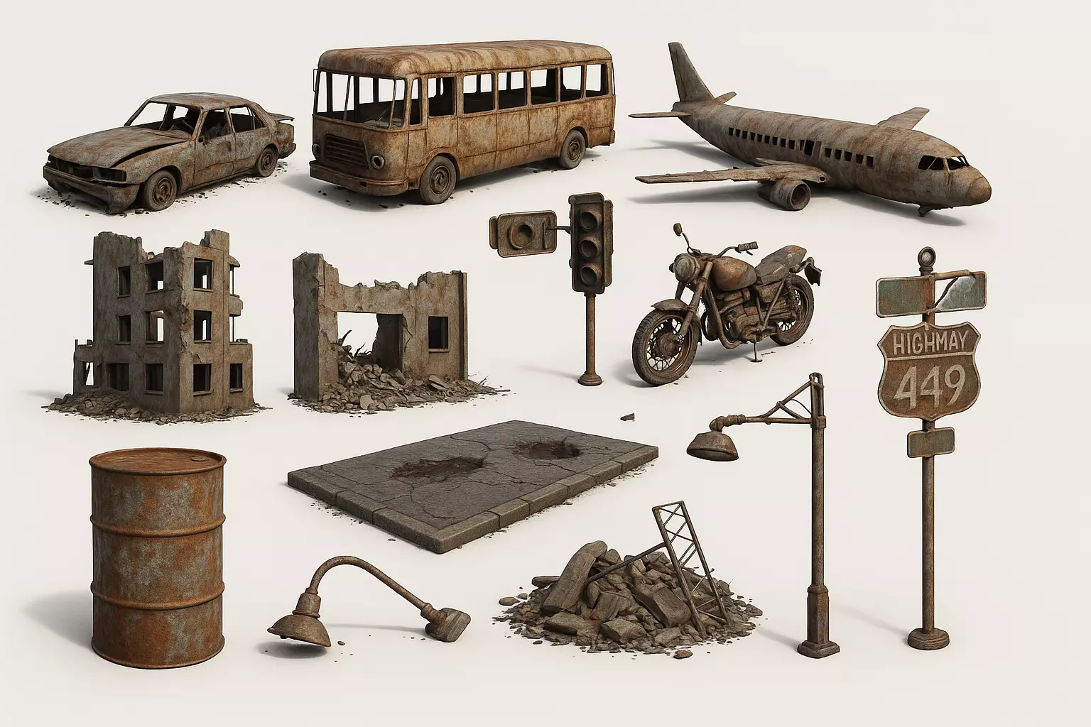 A complete modular post-apocalyptic kit including damaged vehicles, broken buildings, wrecked airplanes, and detailed street props. Ideal for games, animations, and concept art. for gaming and animation it is a good starter packthe base mesh is generated by Ai and it was not free , i retextured and retopo in blender for better usageFormats included: BLEND, FBX, GLB. mix topology, optimized UVs, and non-overlapping textures. 90k poly each object
