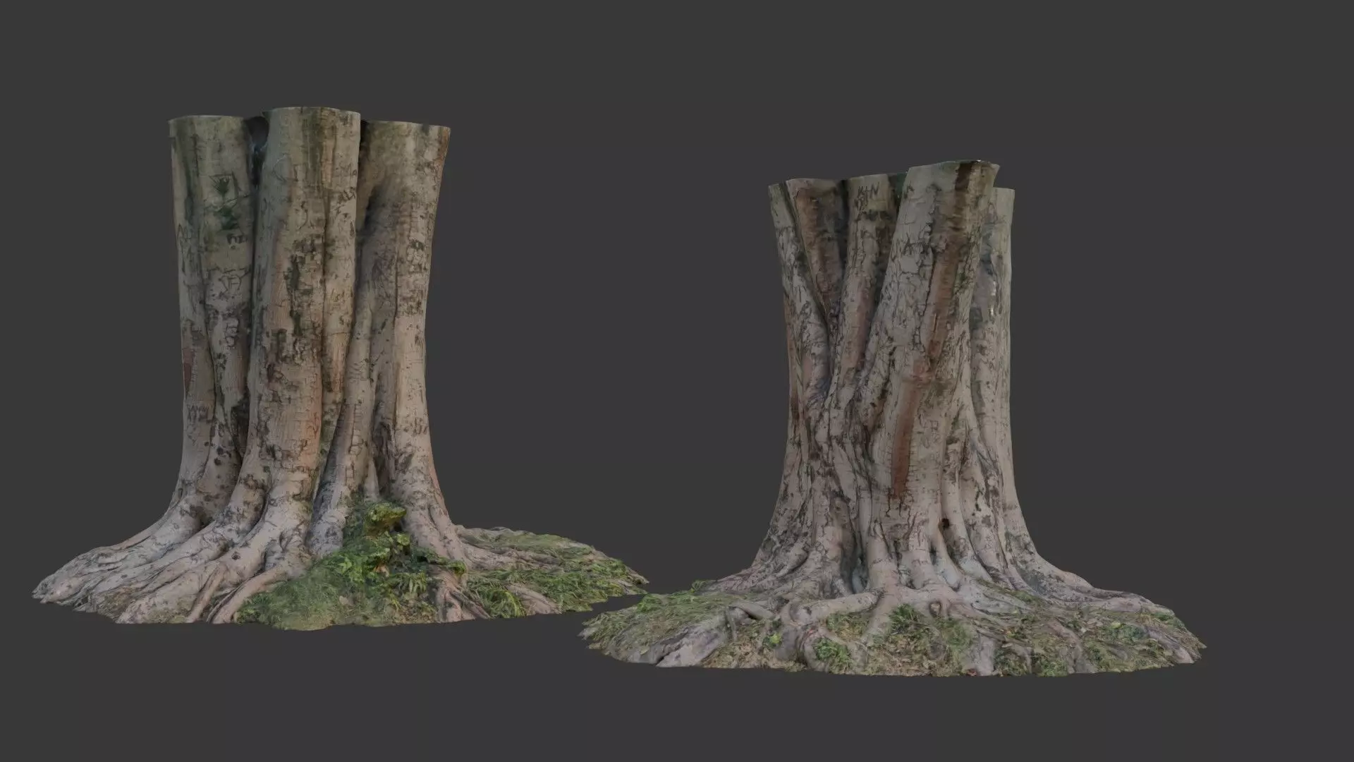 A highly detailed 3D scan of a large, multi-trunk tree stump with exposed roots and natural moss growth. The bark features realistic surface imperfections, including carvings and weathering, making it perfect for realistic forest scenes, game environments, or nature visualizations.