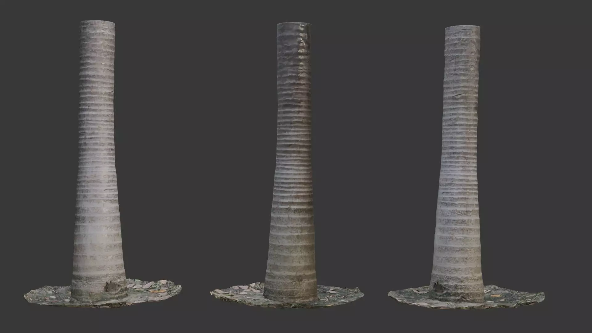 A realistic 3D scanned model of a tall palm tree trunk, featuring detailed ridged bark and a natural base with scattered debris. This high-quality asset is ideal for realistic nature scenes, game environments, and architectural visualizations.