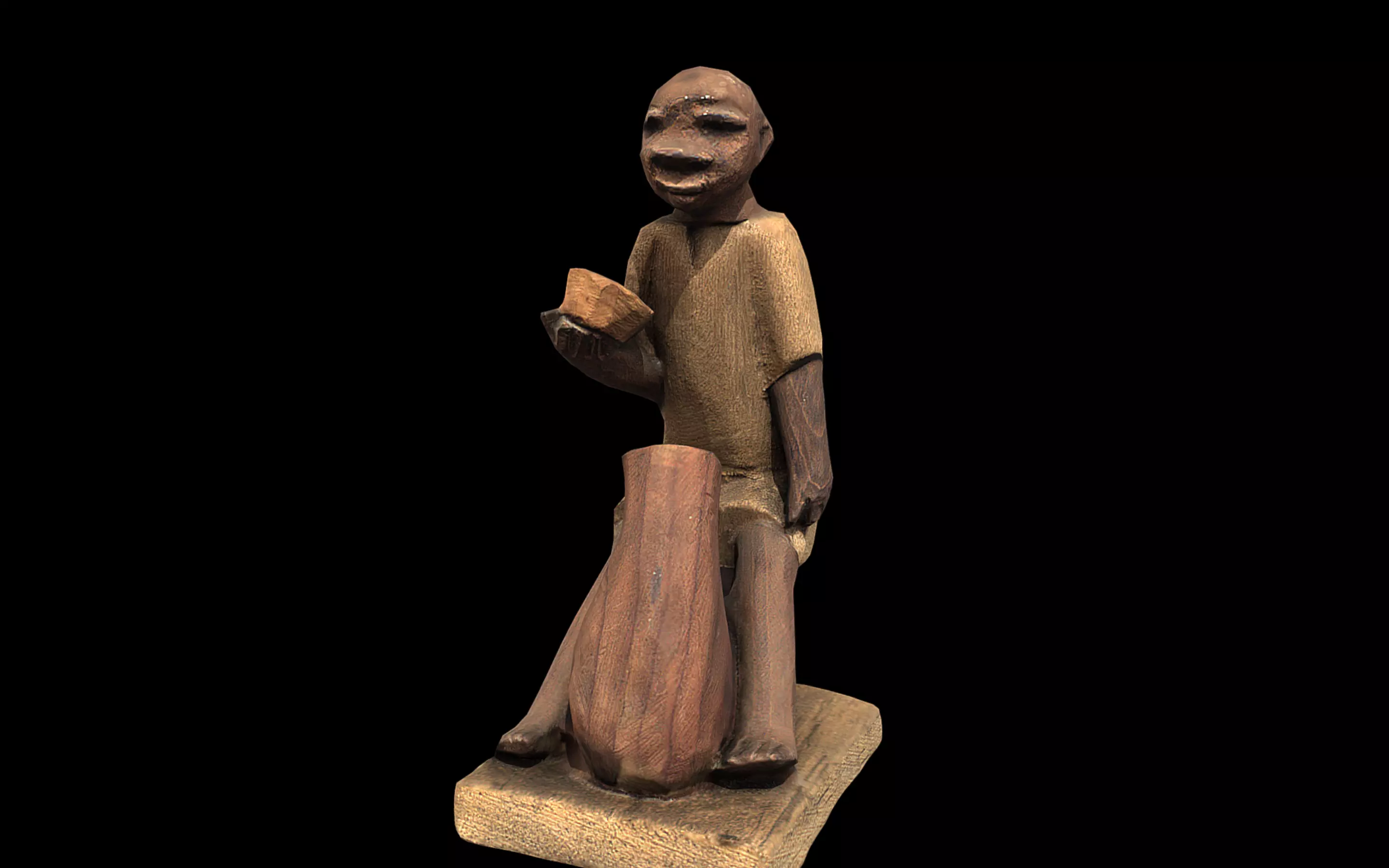 This is a hand-carved wooden sculpture made from thorn wood, depicting a seated male figure engaged in a traditional activity. The figure sits on a low stool, holding a small round bowl in his right hand and positioned beside a large, rounded clay pot. The pot rests on the ground in front of him, suggesting a scene of drinking, serving, or performing a ritual. The figure is dressed in a simple, short-sleeved tunic, and his facial features are stylized with exaggerated eyes, lips, and a bald head, characteristic of Nigerian folk carving styles. The composition captures a moment of everyday life or communal tradition in Nigerian culture.