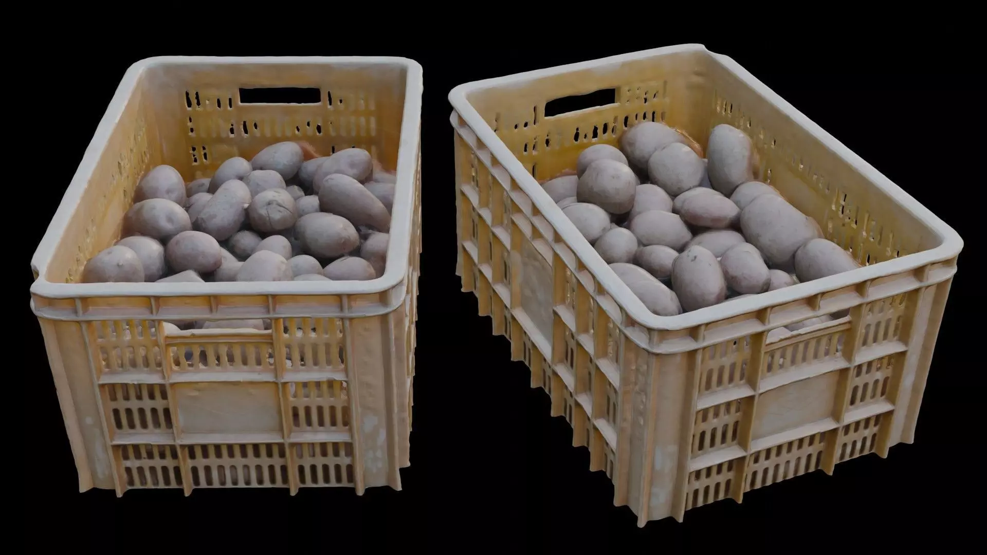 Highly detailed 3D scan of two plastic crates filled with realistic potatoes, showing natural variations in potato size and crate wear. Ideal for market scenes, farm environments, grocery store displays, or agricultural visualization. The model is provided in multiple formats (BLEND, FBX, OBJ, GLB, USD, STL) and includes 4K PBR textures for seamless integration in any pipeline.