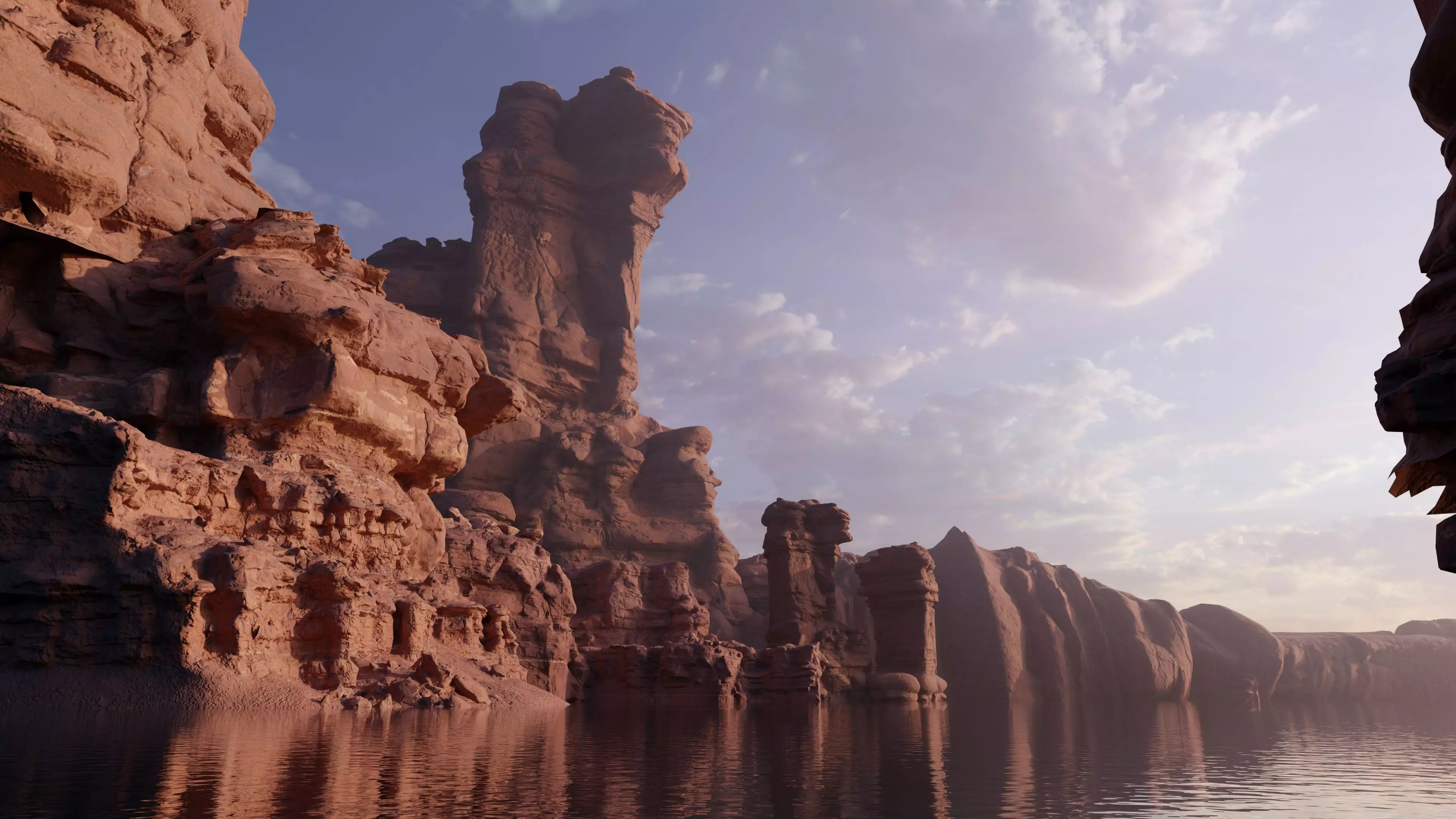 This is a highly detailed 3D desert canyon environment featuring stylized rock formations, tranquil water reflections, and a cinematic lighting setup. Designed to evoke the vast beauty of natural sandstone formations, this scene is perfect for use in visualizations, animations, cinematics, and game environments.