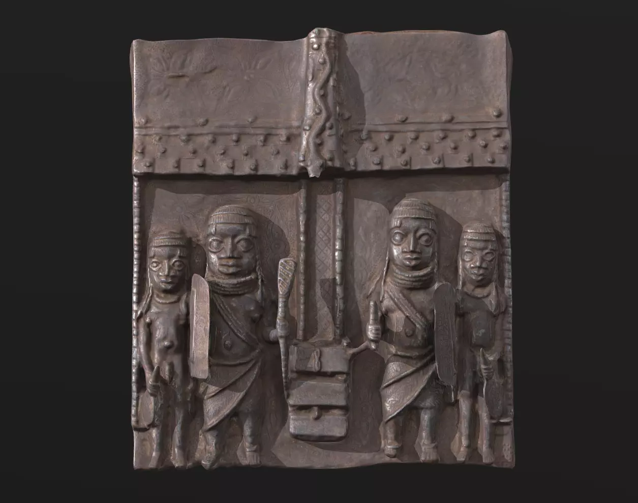 This bronze plaque can be interpreted as depicting the gateway to the Oba's palace in Benin, it features a tower crowned with a bronze-cast bird and snake, marking the entrance to the palace or passageways between courtyards. Here, the roof is adorned with wood shingles instead of palm leaves.The structure is supported by pillars engraved with decorative faces, and it features a bird on top, typically an ibis or sometimes a thrush, symbolizing soothsaying and prophesying in Benin culture. The two armed palace guards on the steps wear aprons and tall coral collars, indicating their high rank within the royal court. The two other attendants are minimally clothed, wearing only small coral necklaces and holding handheld fans. Above the roof, a four-leaf motif associated with Olokun, the god of water, is prominently displayed. This motif frequently appears on bronze plaques from Benin.