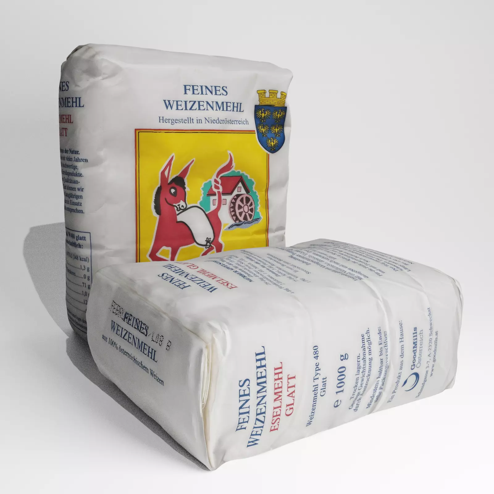 High quality scanned model of a small 1 kg paper sack of flour to add more details and realism to your rendering projects.