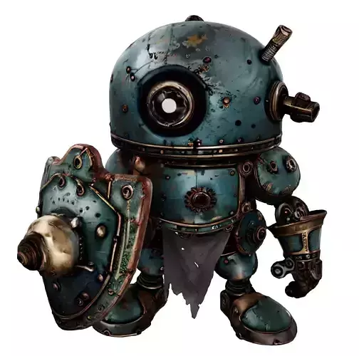 Introducing the Steampunk Battle Bot, a meticulously crafted stylized robot model perfect for game development, animation, collectibles, or 3D printing. This adorable yet armored sentinel combines vintage aesthetics with mechanical charm, featuring a worn, riveted teal metal body, a single large optical sensor, and a weathered shield adorned with brass detailing. A hybrid of form and function, this model embodies the whimsy and grit of steampunk design.