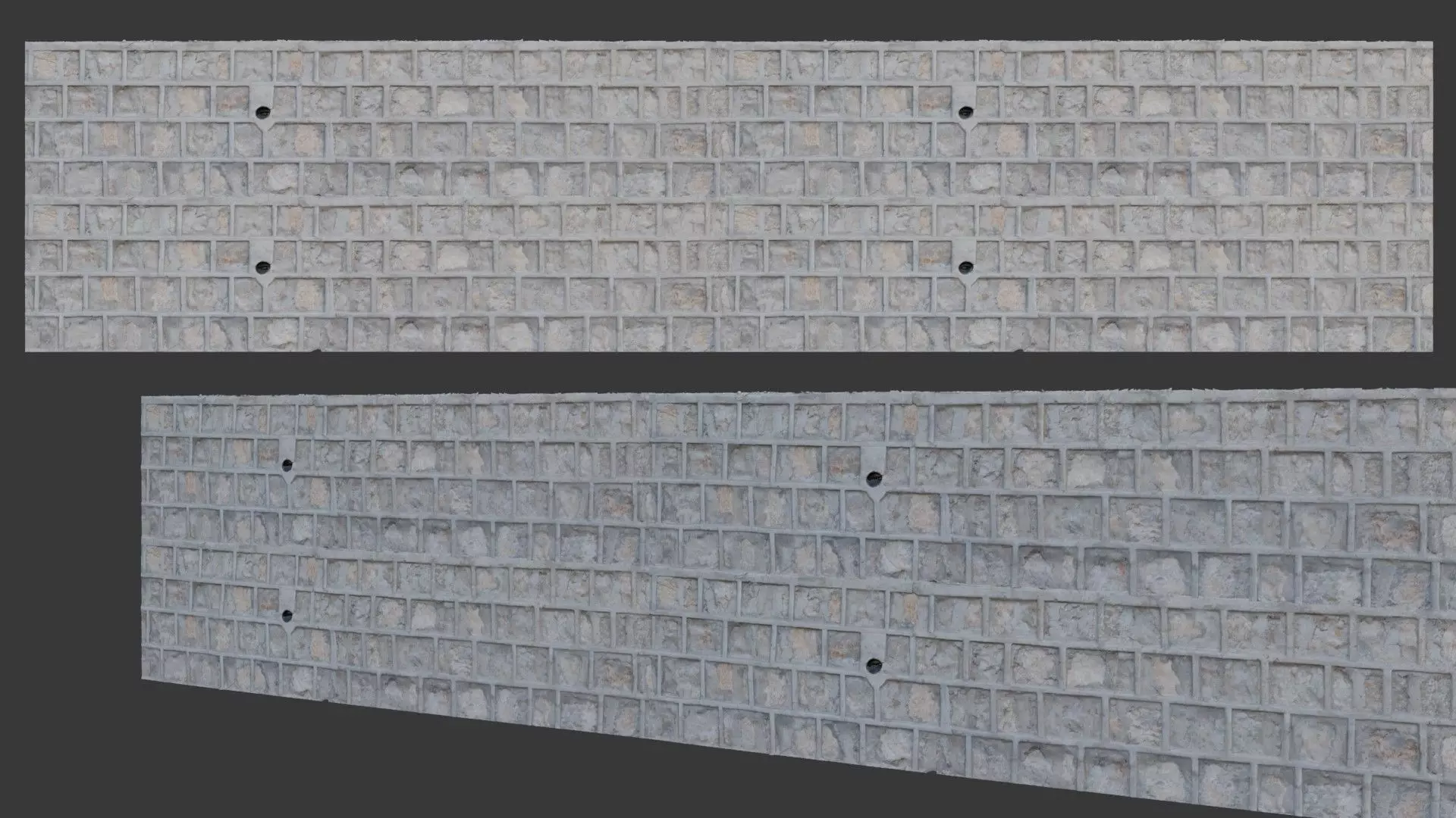 A realistic 3D scanned stone retaining wall with a structured brick pattern and embedded bolts. This asset is ideal for urban environments, roadsides, and architectural visualizations. The high-resolution textures capture the fine details of the stone material and surface imperfections.