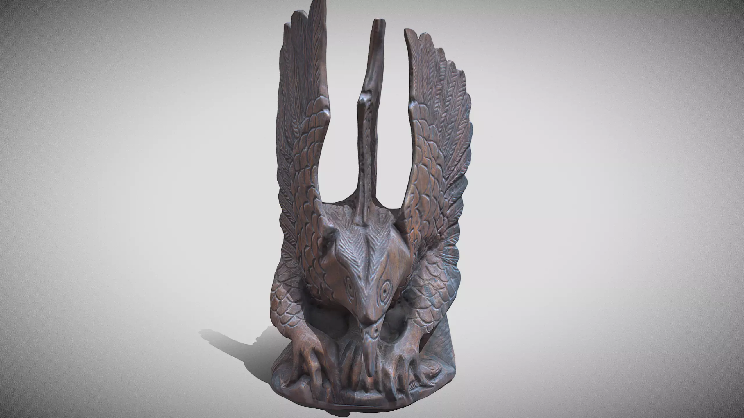 The Sculpture is a finely carved wooden sculpture, showcasing a majestic bird of prey in a dynamic and aggressive stance. Its outspread wings, intricately detailed with overlapping feathers, add to the sense of movement. The bird’s head is tilted downward, with a sharp gaze that seems to focus intently on its target. Its beak is finely carved, reflecting precision and fierceness, while the talons are spread out, as though ready to grasp something. The sculpture captures both the beauty and power of the bird, emphasizing themes of vigilance, protection, and dominance, often associated with such creatures in various cultural contexts.
