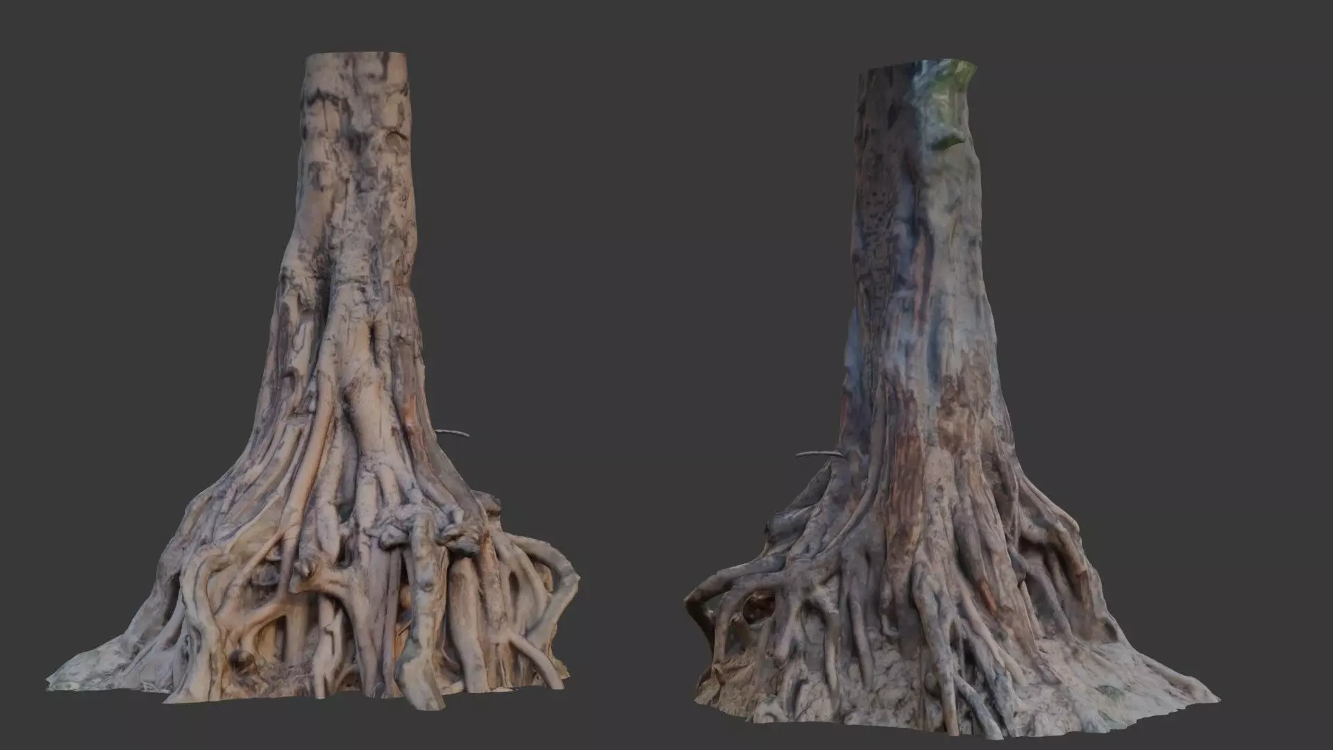 Highly detailed 3D scan of a large tree trunk with a complex root system spreading out at its base. The model captures the deep textures of the wood and the intricate form of the roots. Ideal for natural environments, fantasy scenes, or as a standalone prop. The model is provided in multiple formats (BLEND, FBX, OBJ, GLB, USD, STL) and includes 4K PBR textures for seamless integration in any pipeline.