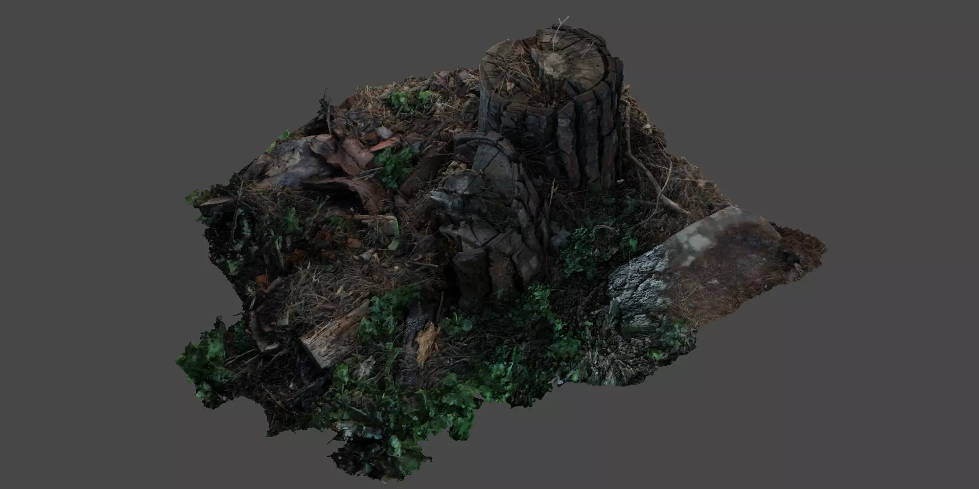 Lush, Integrated Environment: The scan includes elements of the surrounding forest floor, featuring lush, vibrant plant and moss growth integrated into the base, making seamless blending into natural scenes effortless.