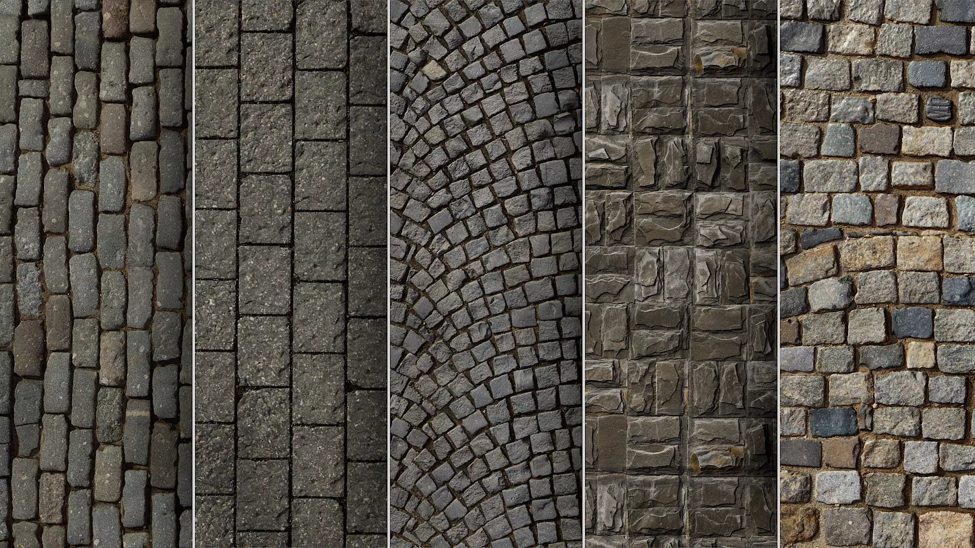 Materials have a displacement map based on real world data (photogrammetry method), which gives the surfaces a realistic volume and texture. Paving slabs of various shapes, colors and sizes.