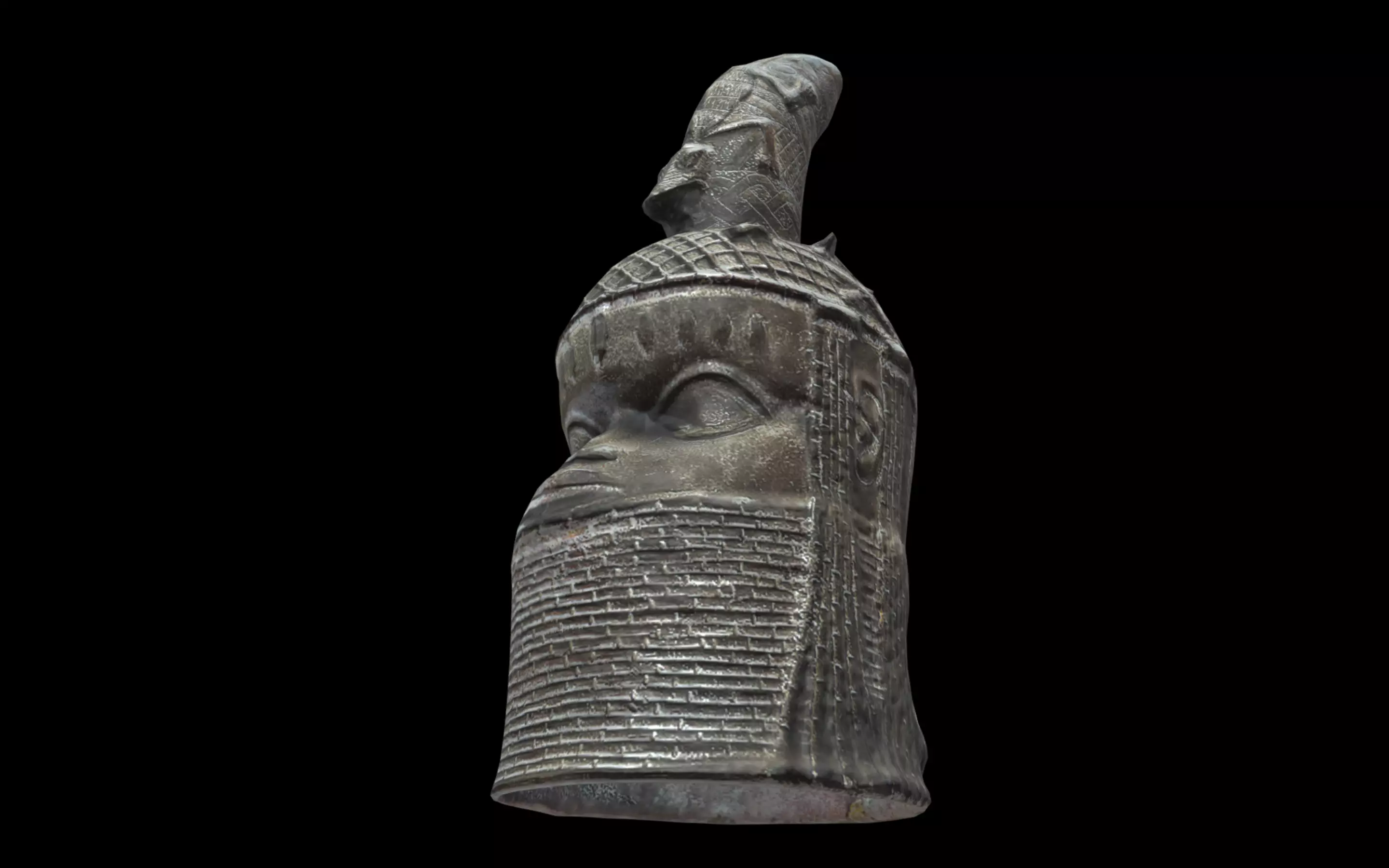 This brass head was commissioned by a newly crowned king to commemorate a previous ruler, likely his father. Mimicking the regal coral-beaded collar and cap, it served as a pedestal for a carved elephant tusk, symbolizing the king’s divine nature. In Benin culture, the head is a significant symbol of authority and power. Known as Uhunmwu Elao, these commemorative heads could be crafted from bronze, wood, or terra-cotta, and feature a central hole for the tusk’s insertion. Through these portraits, kings channeled their deified ancestors to protect their reign. The Uhunmwu-Elao heads were created to honor and commemorate deceased Obas (kings) and sometimes notable queens, and were placed on altars dedicated to these ancestors in the royal palace.