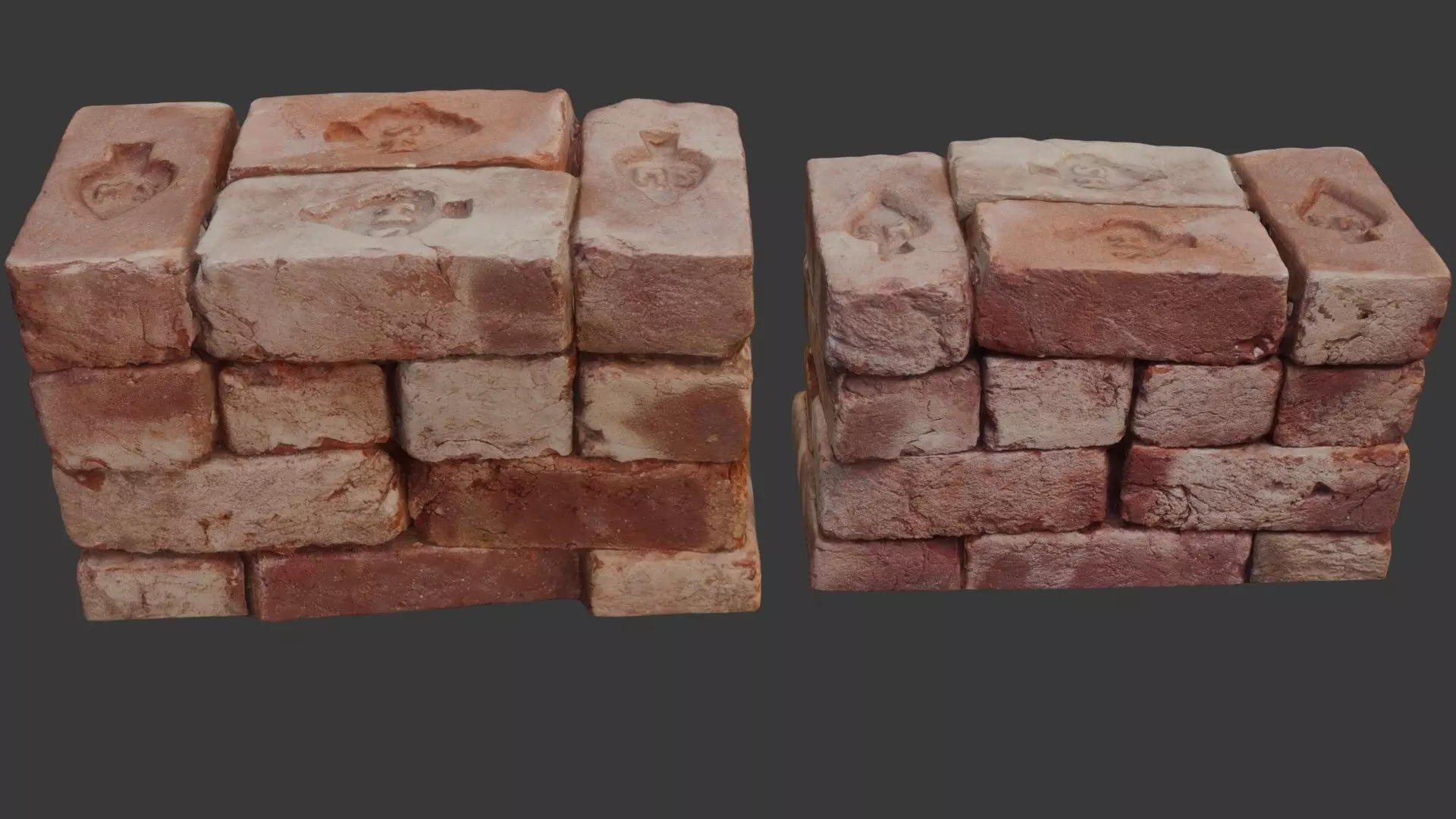 This highly detailed 3D scanned model captures a realistic stack of vintage stamped bricks, showcasing aged textures, natural wear, and distinct engraved markings. The model is perfect for historical reconstructions, game environments, urban scenes, and architectural visualization.