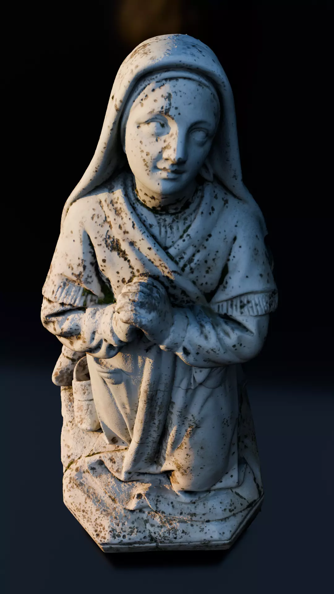 This premium 3D asset features a weathered stone statue of the Virgin Mary, captured using high-end photogrammetry techniques. Every detail of the original stone sculpture, including natural erosion, cracks, and mossy micro-textures, has been preserved in stunning 8K resolution.