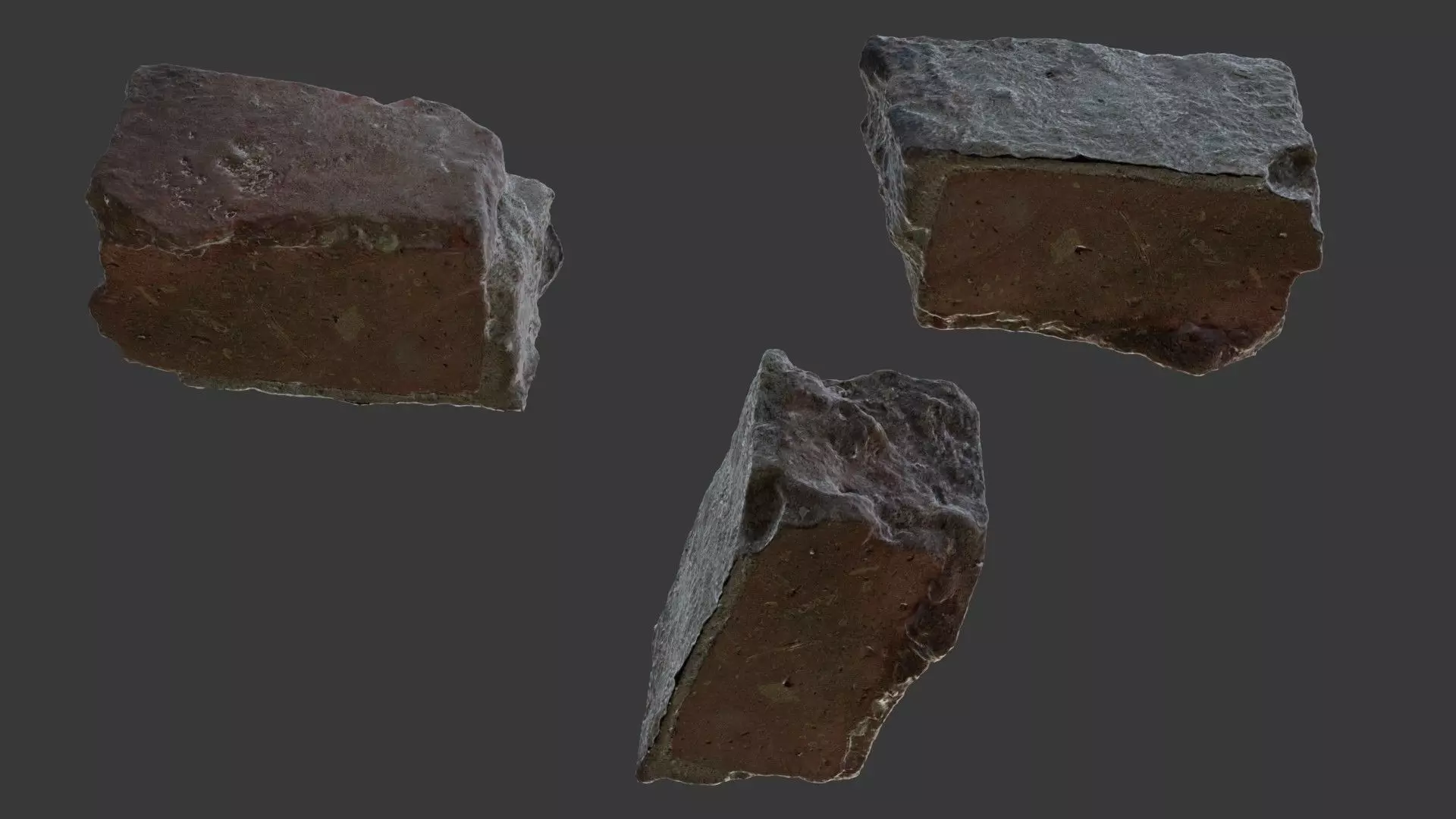 A realistic 3D scan of an old weathered clay brick with detailed cracks, chipped edges, and a rough-textured surface. Ideal for architectural visualization, game environments, and historical reconstructions.