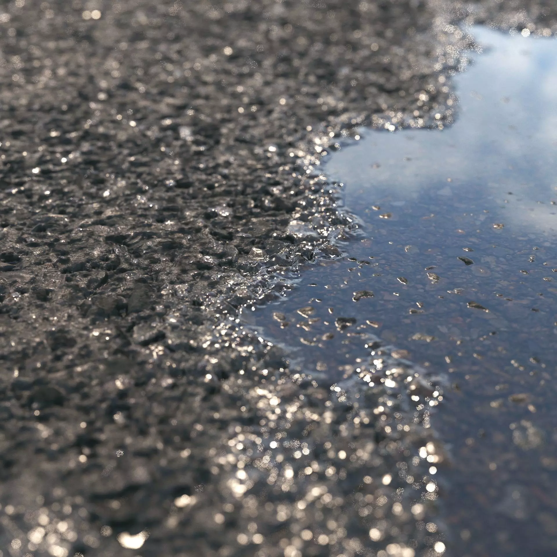 Gray asphalt, clean without cracks or defects. Two variations: dry and wet with puddles. Puddles are done procedurally through the Noise map (do not have bitmap textures)
