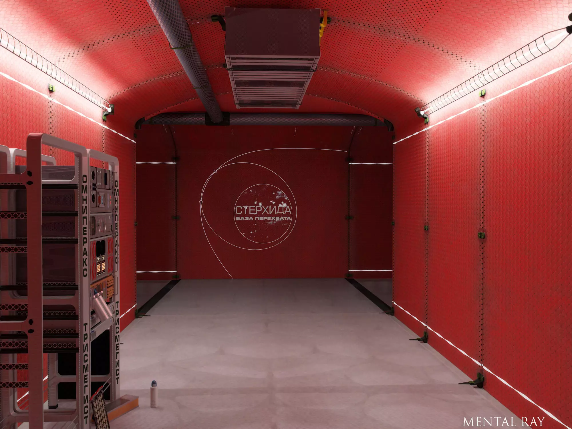 Service corridor from modular elements, meant to separate human-serviceable compartments within larger technological spaces. This scene is only available in Mental Ray renderer with Arch&Design materials.Scene will render as seen in previews, lense effects added in Photoshop.