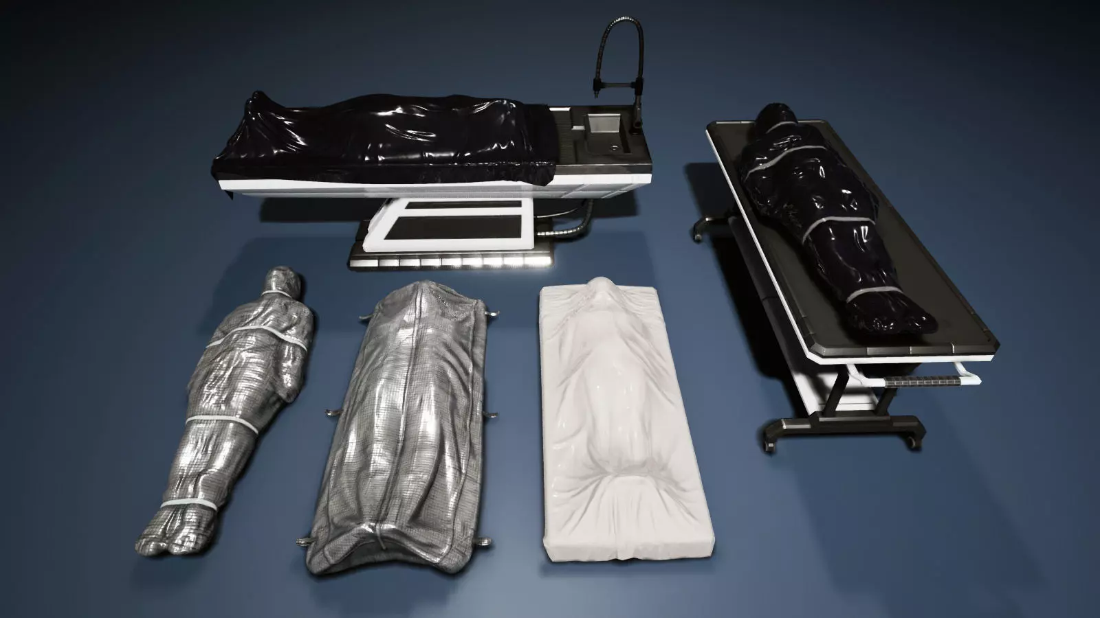 This low-poly asset pack includes realistic body bags and morgue tables, perfect for modern, sci-fi, cyberpunk, or futuristic environments.