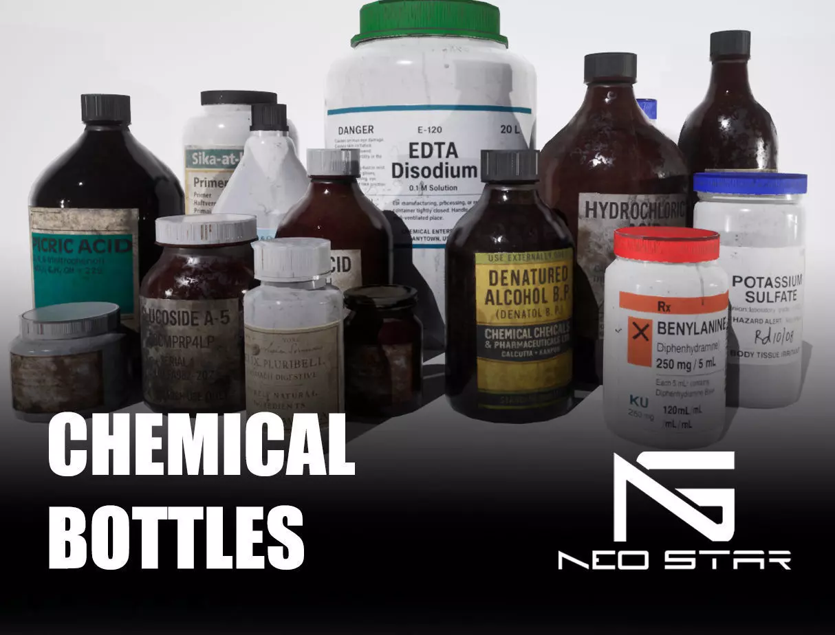 Low-poly chemical bottles designed for use in games. Featuring a worn and weathered aesthetic, this asset is perfect for post-apocalyptic and horror abandoned lab environments.