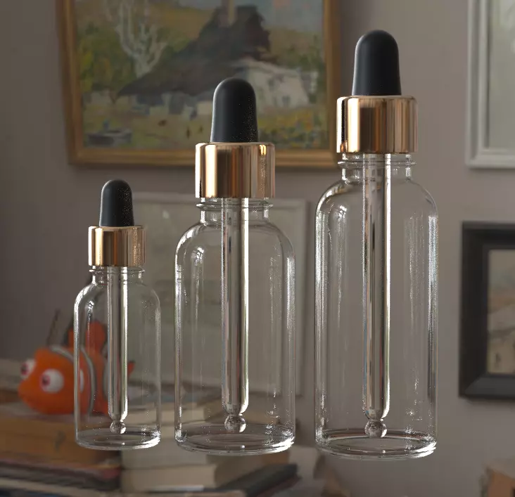 Cosmetic Dropper Bottle 3D Model – Transparent Glass & Gold Cap