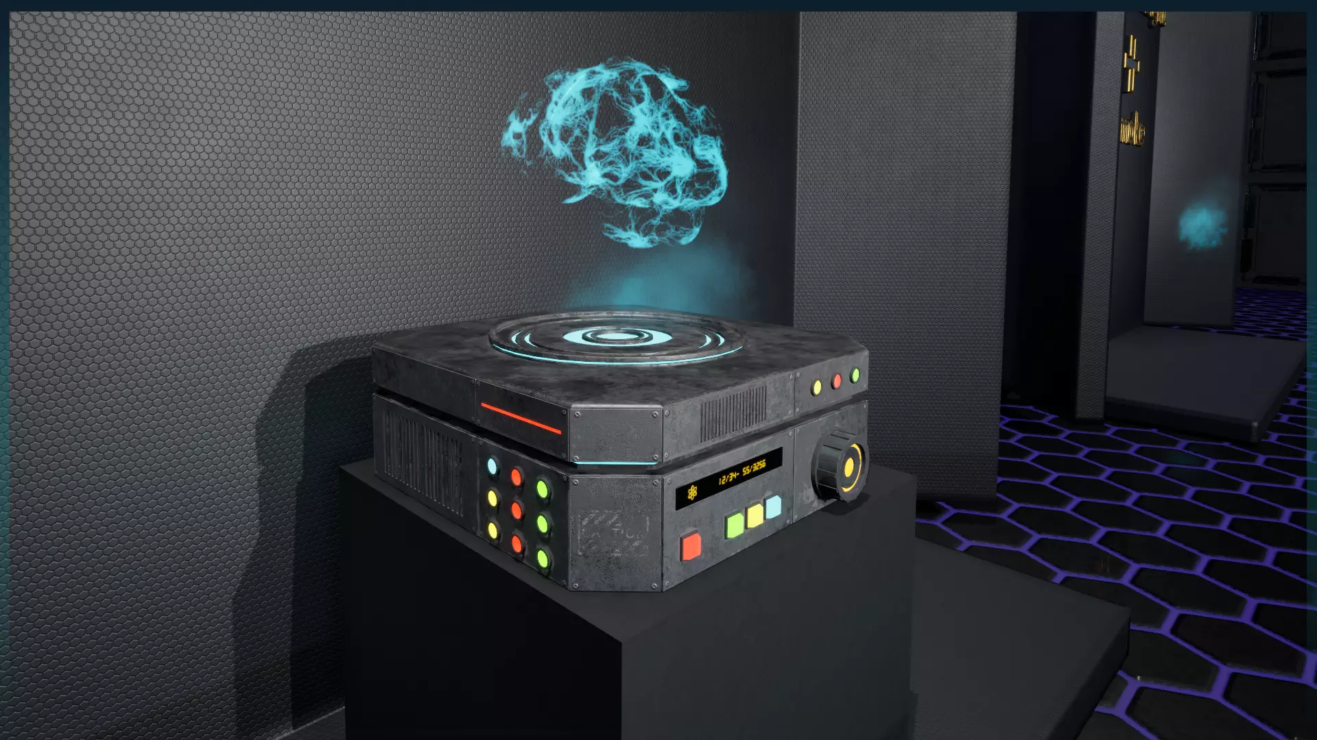 SM_Brain: The brain features an animated material responsible for the effects. I aimed to simulate synapses exploding and then reconnecting while also portraying the device as aged, which is why I simulated glitches.1 Blueprint: The blueprint integrates the SM_Brain to enable animation. I made it rotate and added a collision box for the audio (a machine-working sound). The audio activates when approaching the device and deactivates when moving away.