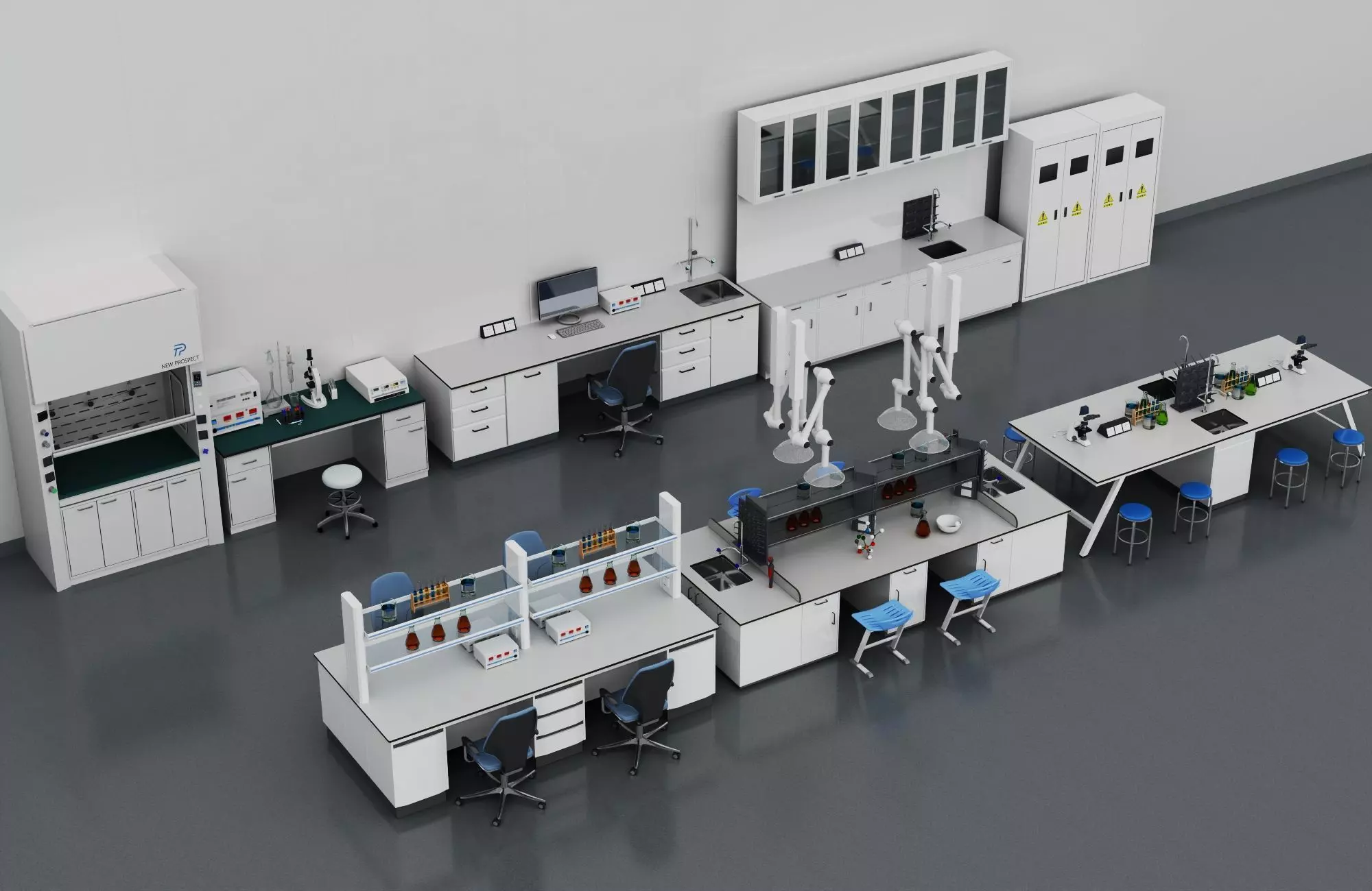 This premium 3D model features a cutting-edge modern laboratory equipped with advanced automation, including multiple robotic arms for sample handling, biological safety cabinets (BSCs), fume hoods, microscopes, computers, test tubes, flasks, reagent bottles, sinks, storage cabinets, and ergonomic blue stools/chairs. The clean, minimalist design with white and gray tones, dark flooring, and organized workstations is ideal for depicting futuristic research facilities in chemistry, biology, pharmaceuticals, or robotics. Perfect for scientific visualizations, animations, VR training simulations, game development, architectural renders, or educational content. High-detail textures, clean topology, and optimized for professional rendering.