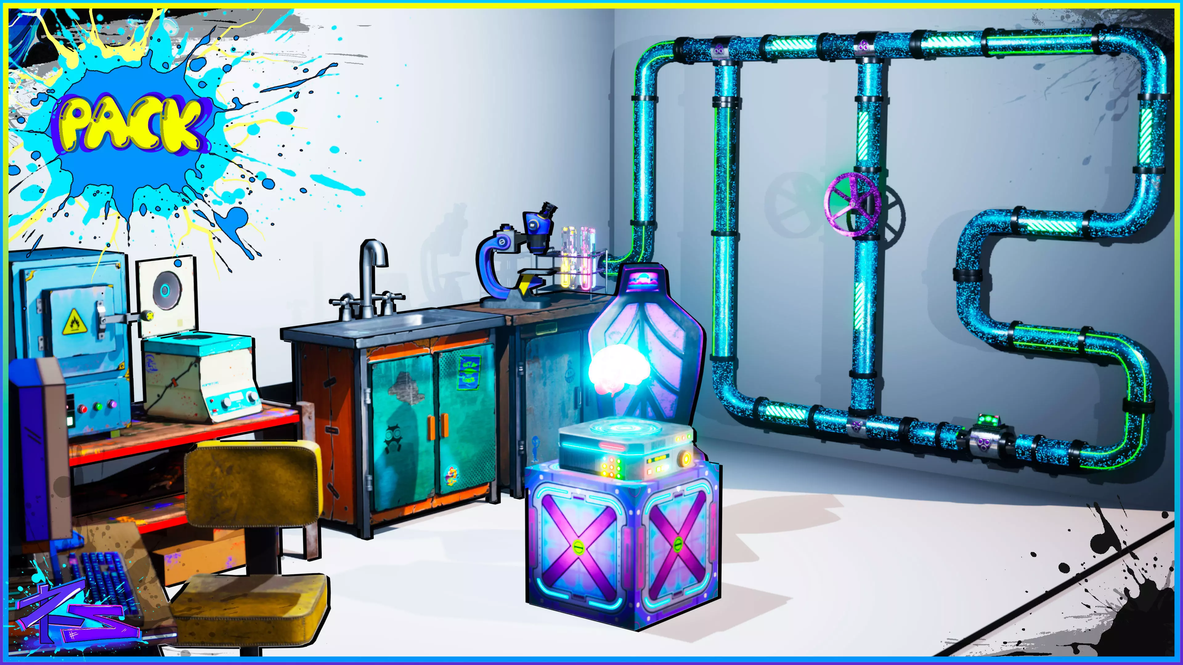I created these stylized laboratory assets with hand-drawn ink outlines applied to every edge and detail. /I personally painted all the highlights by hand rather than using procedural methods, focusing on artistic quality for every visual element./I also created a holographic brain with visual effects. It blinks and shifts from blue to red, simulating synapses, and releases smoke from the base of the device./The sci-fi pipes are also included in the laboratory pack, complete with their own smoke VFX. Additionally, there is an emergency exit that I've already set up with a blueprint to open upon proximity./