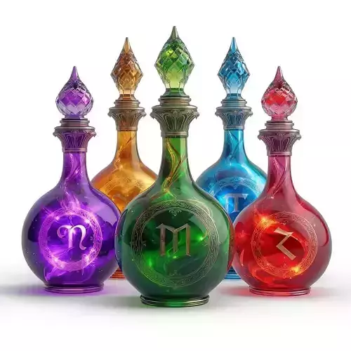 Mystical Runes Each bottle is etched with a glowing magical symbol, suggesting different effects.