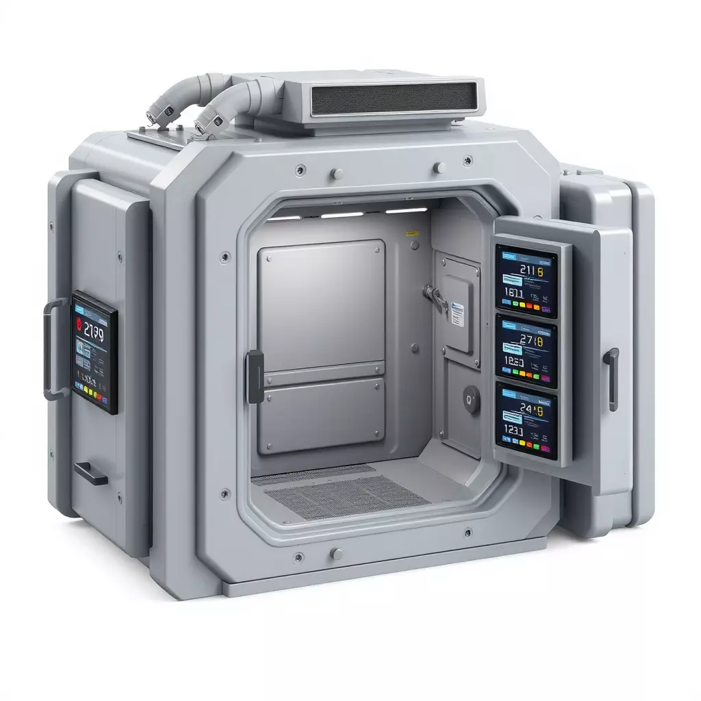 This is a meticulously crafted 3D model of a futuristic, modular laboratory incubator or advanced secure storage unit, designed with a robust sci-fi aesthetic. The model features a heavy-duty, industrial grey exterior adorned with visible bolts and sturdy panels, conveying durability and high-tech functionality. Its articulated design includes a meticulously detailed interior chamber, accessible through an openable door, complete with a grated floor texture and additional metallic paneling. Prominently integrated digital displays on the exterior and interior provide dynamic readouts, enhancing the futuristic immersion. Advanced ventilation pipes and a top-mounted air grille suggest sophisticated climate control or environmental sealing capabilities. This asset is perfectly suited for a wide array of digital projects, including immersive sci-fi game development, creating realistic environments for virtual reality (VR) and augmented reality (AR) experiences, detailed architectural visualizations of future facilities, and high-quality renders for film, animation, or digital art. The model boasts clean, optimized topology, ensuring efficient performance in real-time engines while retaining high visual fidelity for cinematic close-ups. It is fully UV unwrapped with professionally crafted PBR (Physically Based Rendering) textures, guaranteeing realistic material interactions under various lighting conditions. Supported file formats typically include GLB, FBX, OBJ, and USD, offering broad compatibility across major 3D software and game engines. This asset is ready to be integrated into your next project, offering a versatile and visually striking piece of advanced technology.