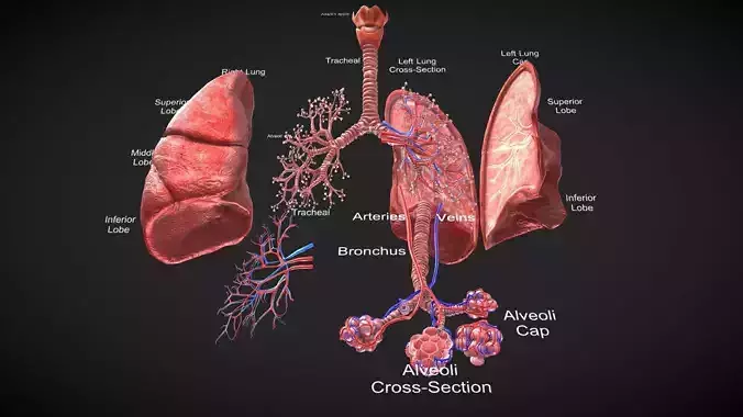 This highly detailed 3D anatomical lung model features a realistic and educational representation of the human respiratory system. It includes the trachea, bronchi, alveoli, lungs with lobes, and detailed artery/vein branching, offering a comprehensive visual of both macro and micro structures.