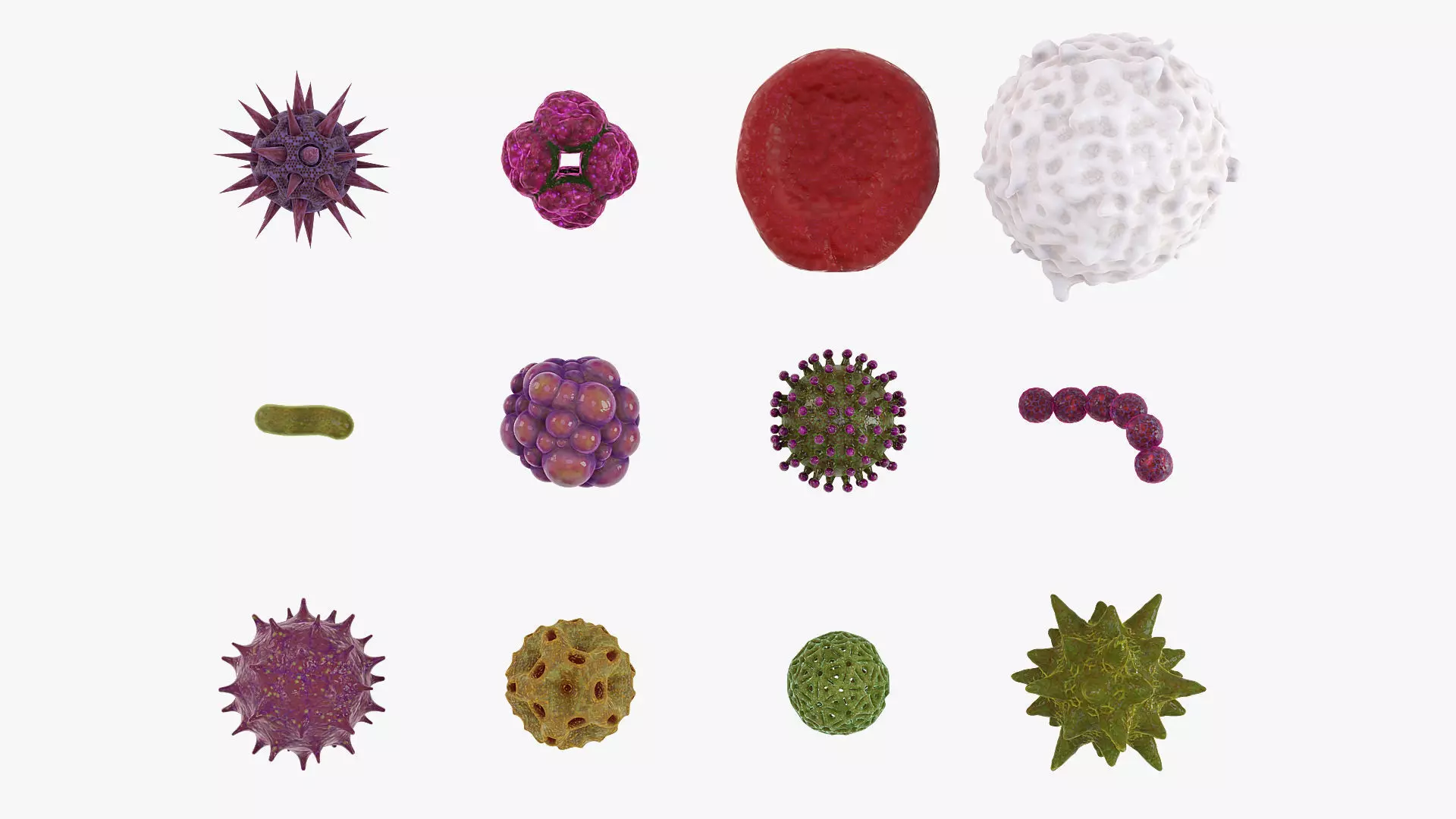 • 12 models, including 10 microbes (viruses) and red and white blood cells