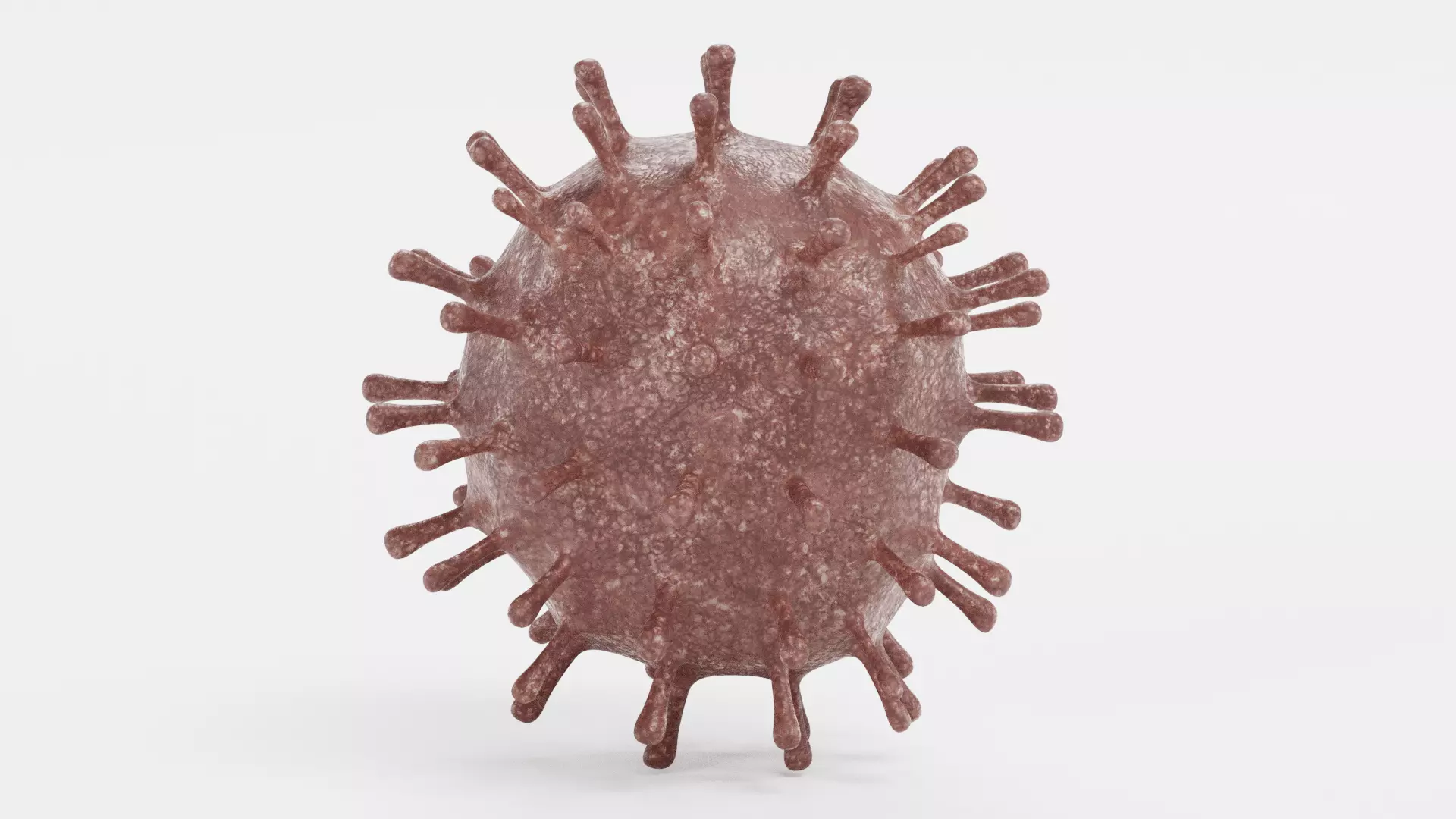 A realistic 3D model of the SARS-CoV-2 coronavirus, designed with accurately shaped spike proteins and an organic surface structure characteristic of COVID-19 virions. The structure follows commonly referenced scientific visualizations, giving the model a reliable appearance.