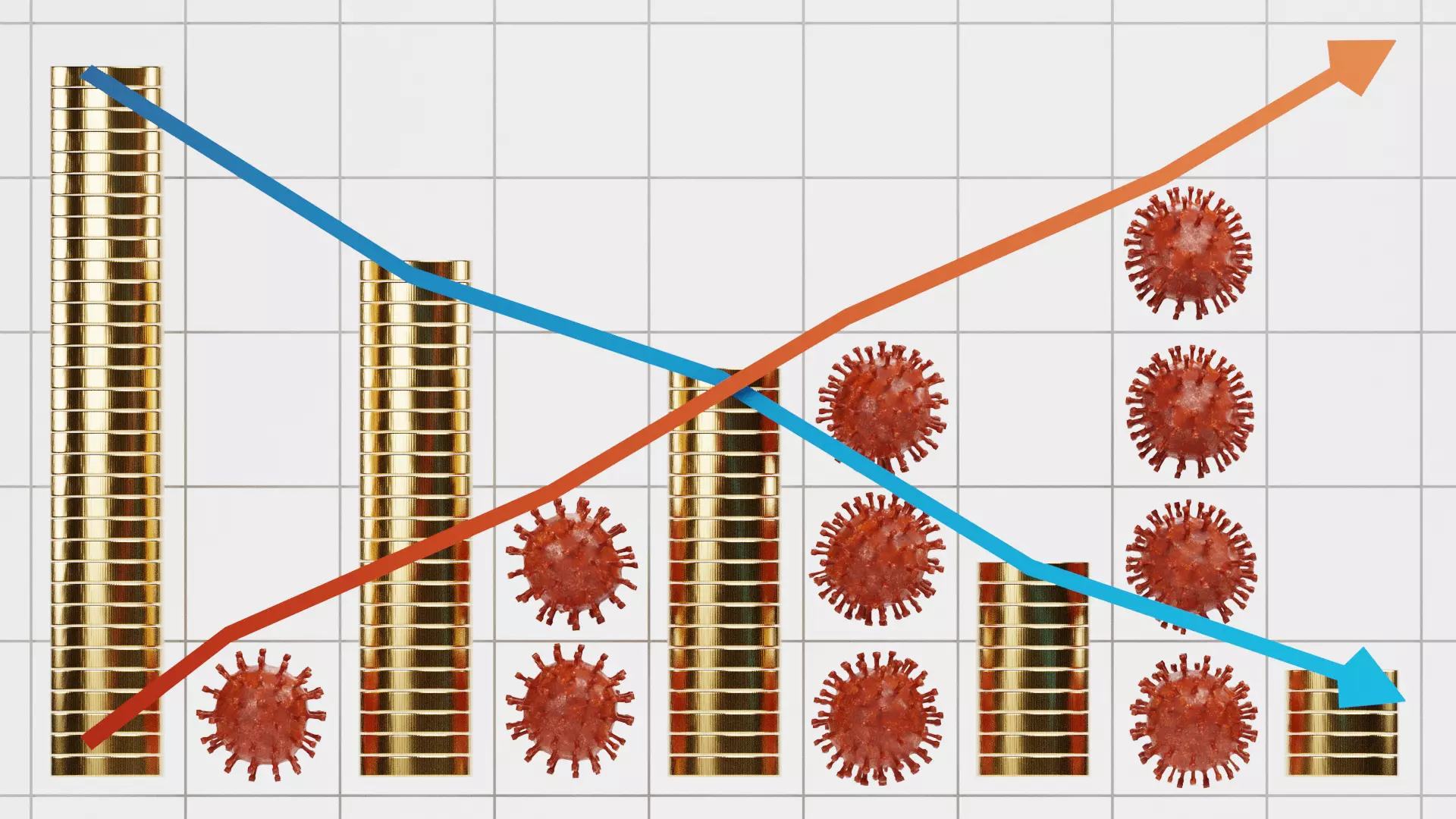 Concept-driven 3D graph visualizing the relationship between economic activity and pandemic impact through a clear and instantly readable setup. The composition uses stacked coins and virus forms arranged in opposing columns, supported by directional arrows that highlight rising and declining trends. This visual contrast creates an intuitive representation of imbalance and shift, making the asset suitable for presentations, motion graphics, and explanatory content focused on global events, economic disruption, or crisis scenarios.