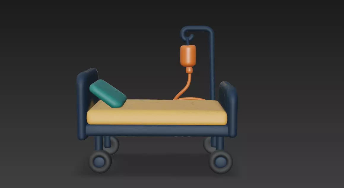 This Cute Hospital Bed 3D Model features a stylized, cartoon-inspired medical bed complete with wheels, side supports, mattress, pillow, and an attached IV stand. The model is designed with smooth rounded shapes and soft proportions, making it friendly, approachable, and ideal for healthcare visuals aimed at children and casual audiences.