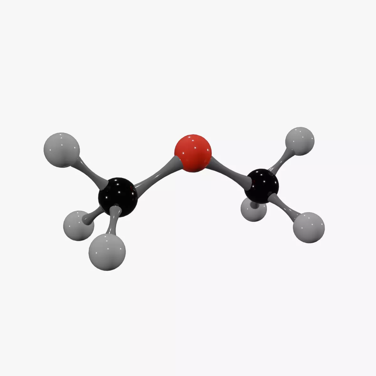 This Dimethyl Ether (DME) Molecule 3D model showcases the chemical structure of a simple ether, consisting of two methyl groups connected by an oxygen atom. Dimethyl Ether is a colorless gas with applications as an aerosol propellant, refrigerant, and a clean-burning alternative fuel. It also serves as a precursor in organic synthesis. This model is ideal for use in educational demonstrations, chemical research visualization, industrial presentations, and scientific animations.