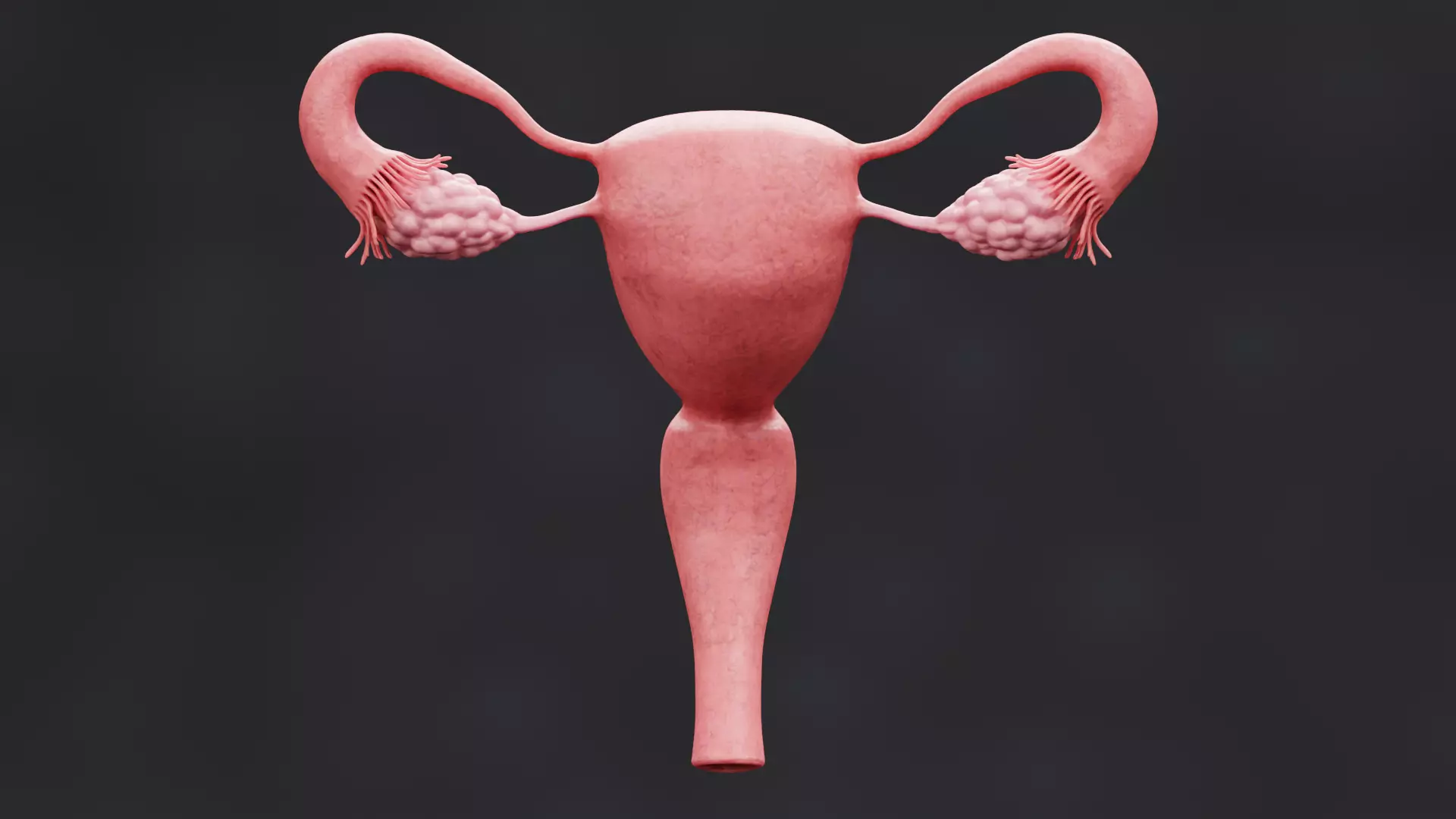 A scientifically accurate and high-detail representation of the female reproductive system, including the uterus, ovaries, vagina, fimbriae, and ovarian ligaments. This model captures the external structure with anatomically correct proportions and surface forms. Subtle material variations and refined texturing highlight the distinct tissue characteristics of each organ – from the smooth uterine walls to the lobulated texture of the ovaries – providing a clear, realistic depiction suitable for professional and educational visualization.