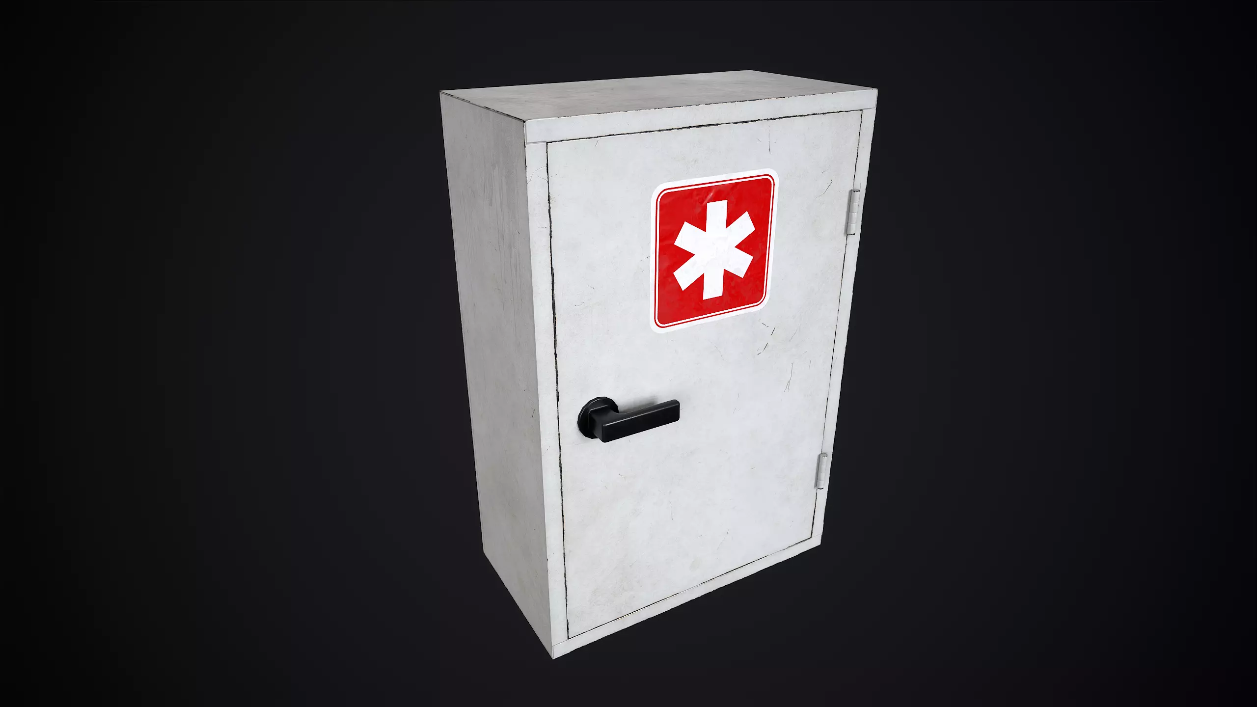 A realistic medical cabinet with an interactive door and movable handle. Inside, it features two shelves for storage.