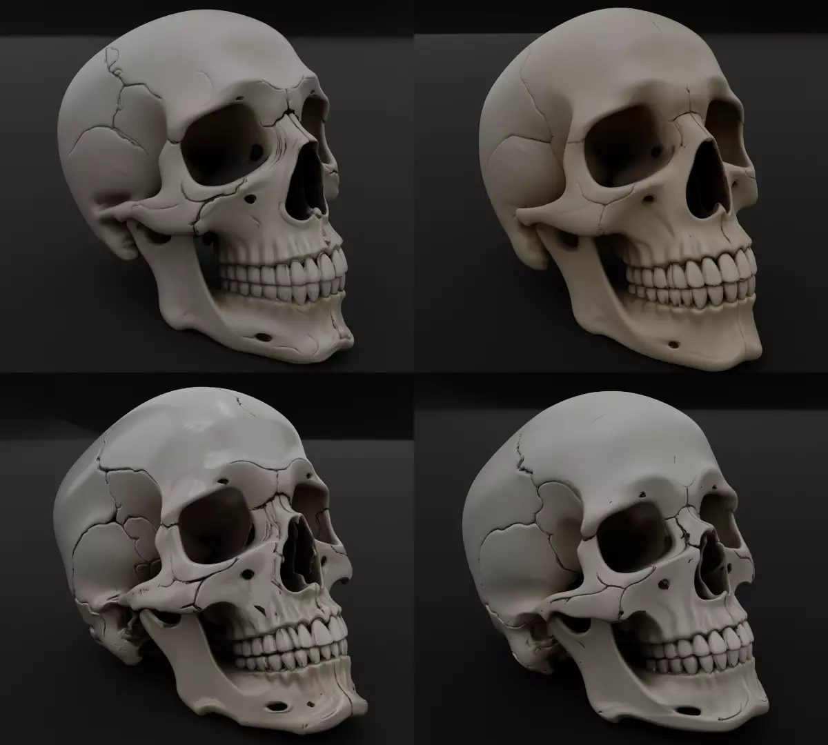 This product is a professional 3D asset pack featuring a collection of four high-quality human skull models, each with unique cracks, fractures, and structural variations. The set was designed to provide maximum visual diversity while maintaining anatomical accuracy and realistic proportions.