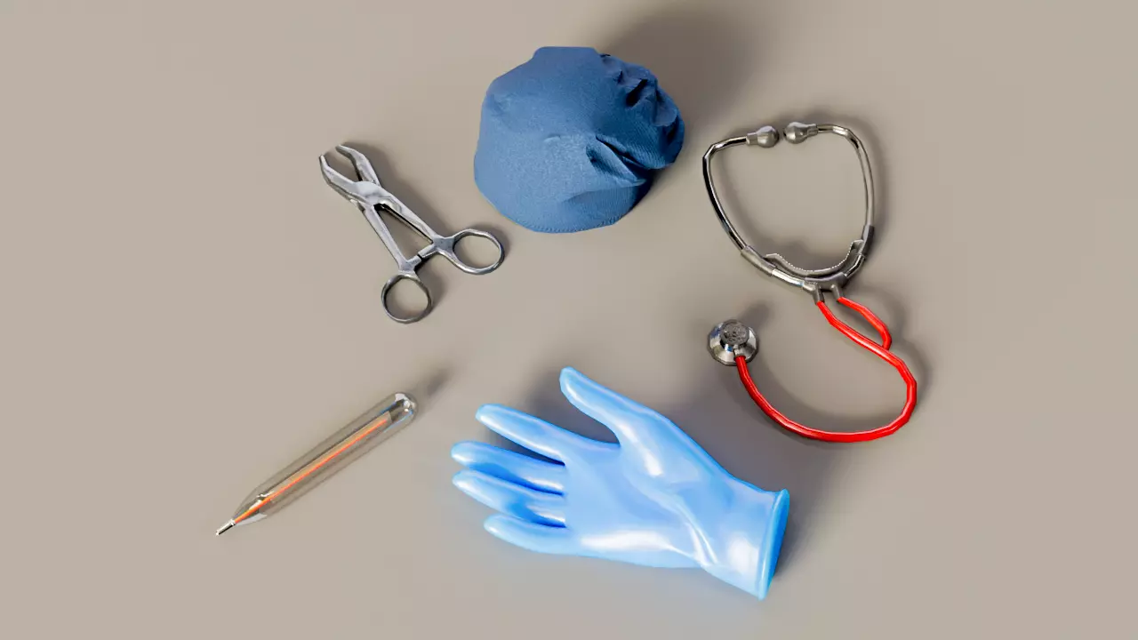 Stethoscope, Surgical Scrub Cap, Latex Glove, Surgical Forceps, Clinical Thermometer.