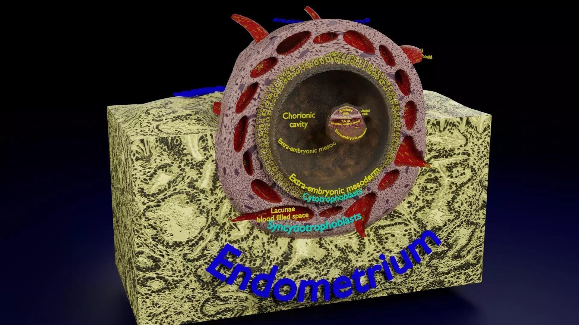 File formats included are obj, mtl, stl and blend with textures. The blend model depicts a 14 days human embryo along with its covering layers and its lodgment in the endometrium. The epiblastic, hypoblastic, mesodermal, cytotrophoblastic and syncytiotrophoblastis layers along with cavities within them namely amniotic, yolk sac and chorionic cavity is nicely depicted. All the parts are labelled. The blend file has modifiers including subdivision and multiple diplace modifiers. The vertex count is without subdivision modifier applied. There are two models with one having procedural texture and other with image textures applied.The material has image texture based on non-overlapping UVs.