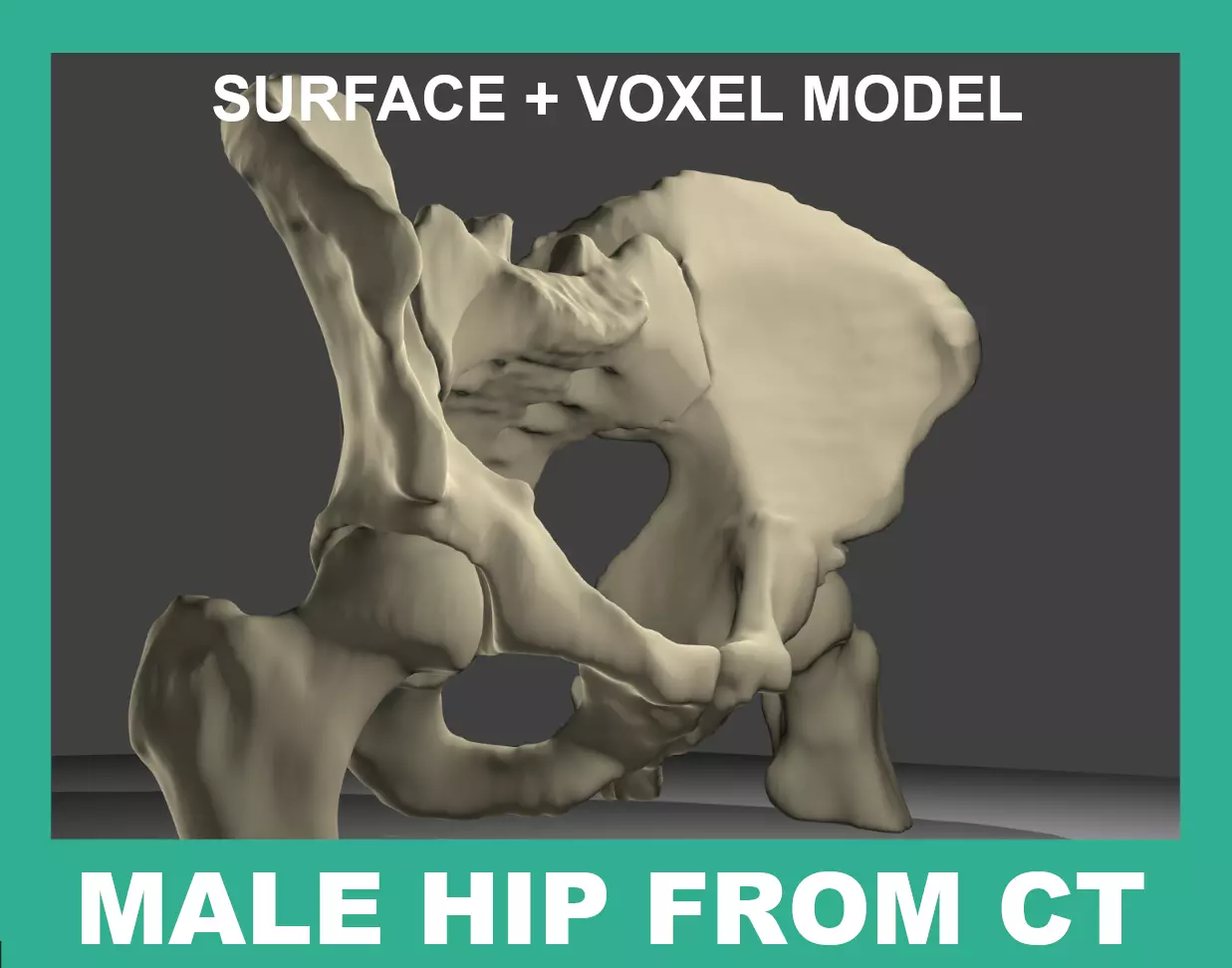 You get each of the four human hip bone 3D models as a surface model and as an unprocessed voxel model. This allows you to use the data individually. The voxel model is the raw volumetric output of the segmentation process of the bones out of the DICOM file.