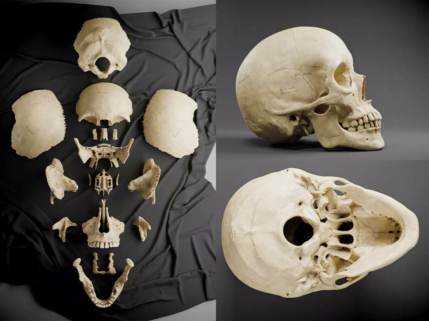 The bones of the skull are seperated and named accordingly: