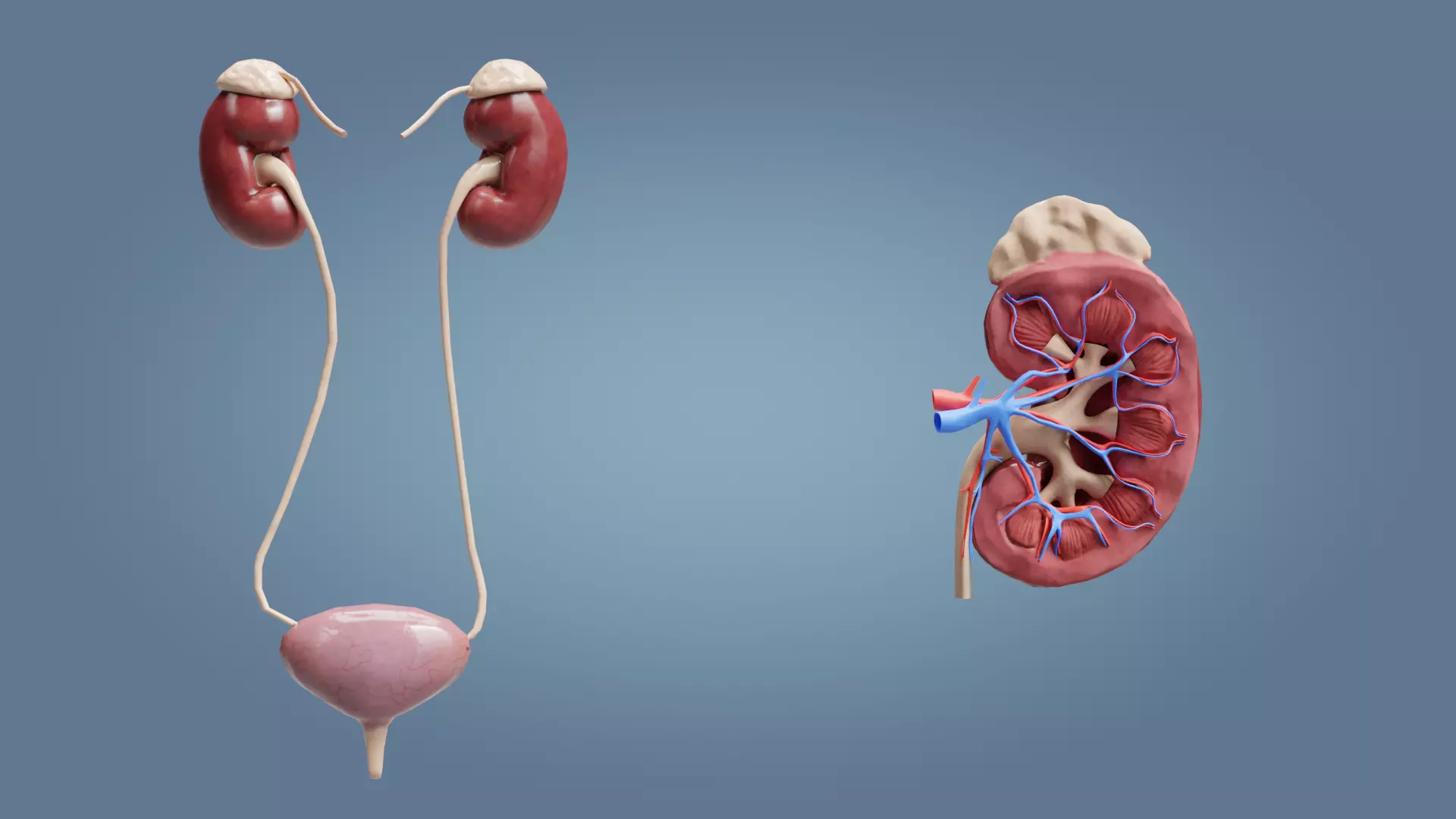 Kidneys with bladder and a cross section of the kidney