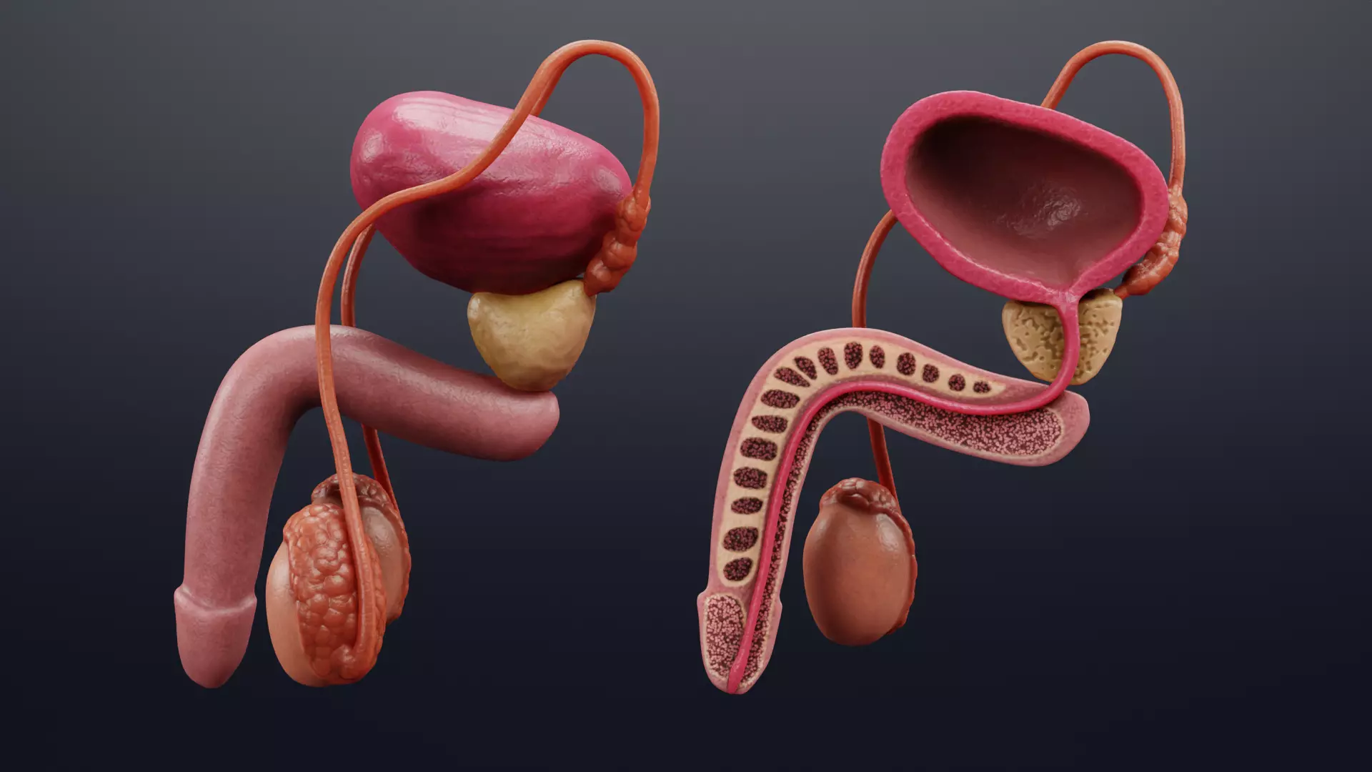 A comprehensive 3D anatomical set combining both the external and cross-sectional models of the male reproductive system. The collection includes all major components: penis, testicles, prostate, vas deferens, bladder, seminal vesicle, and glans, with the cross-section additionally exposing the urethra and erectile tissue for deeper anatomical insight. Together, these models provide a complete educational reference for studying male anatomy in both structural and internal detail, designed for scientific, medical, and instructional applications.