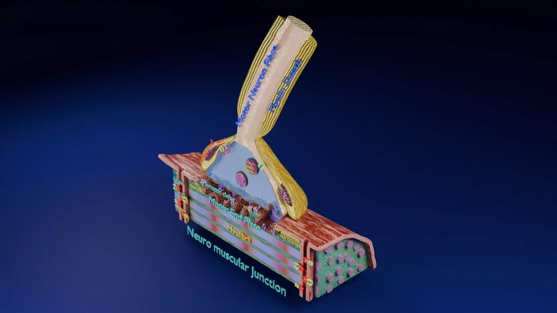 The model schematically depicts the neuromuscular junction structural and ultra structural details. The neuron ends have voltage gated sodium and calcium channels which releases acetylcholine molecules stored in synaptic vesicles into the synaptic cleft. The receptors present in motor end plate and T tubules of muscle fibre finally increase intacelluar calcium which leads to muscle contraction Excellent model for teaching, demonstration and knowledge of human body. The models include both procedural and image textures blend files separately. The texture file includes diffuse, roughness, and normal png and jpeg based on non-overlapping UV maps.The formats 3mf, ply, obj, fbx, USDZ, GLTZ & GLB with applied uv mapped textures have also been included in the downloads along with stl.I have included the various formats needed by various customer for the various 3d modelling software they may be using. The following formats are compressed in rar formats:-