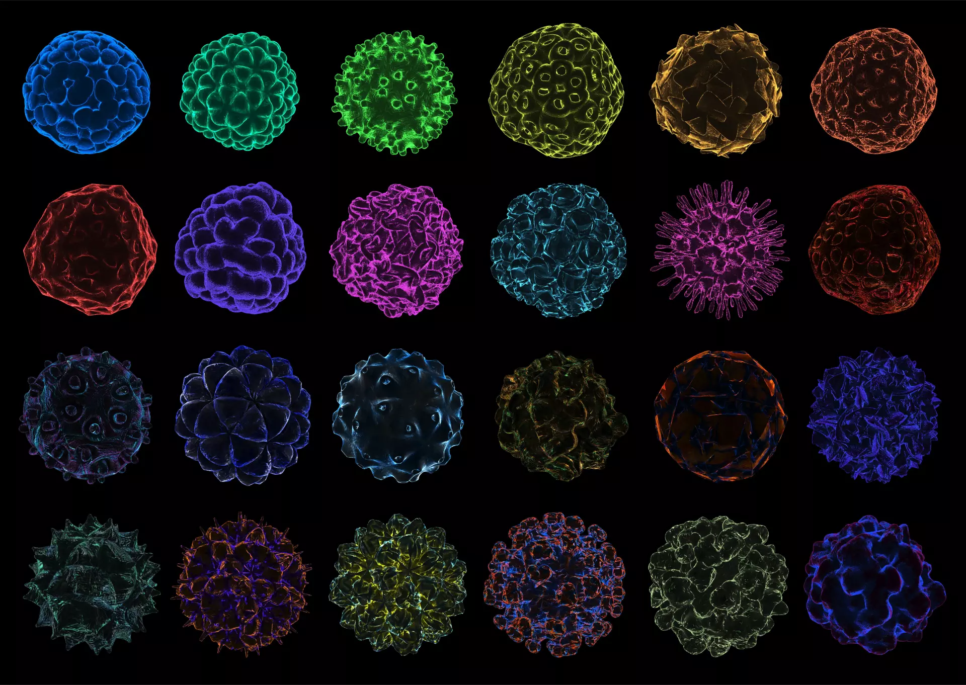Models: Virus 01 - Polygons: 107362 Vertices: 53587Virus 02 - Polygons: 58454 Vertices: 29241Virus 03 - Polygons: 59832 Vertices: 29918Virus 04 - Polygons: 145945 Vertices: 72985Virus 05 - Polygons: 83138 Vertices: 41551Virus 06 - Polygons: 128888 Vertices: 64170Virus 07 - Polygons: 37330 Vertices: 18669Virus 08 - Polygons: 62114 Vertices: 31059Virus 09 - Polygons: 71136 Vertices: 35576Virus 10 - Polygons: 129206 Vertices: 64455Virus 11 - Polygons: 154636 Vertices: 77318Virus 12 - Polygons: 47270 Vertices: 23681Virus 13 - Polygons: 55820 Vertices: 27912Virus 14 - Polygons: 89626 Vertices: 44835Virus 15 - Polygons: 59772 Vertices: 29888Virus 16 - Polygons: 53104 Vertices: 26554Virus 17 - Polygons: 48854 Vertices: 24475Virus 18 - Polygons: 88412 Vertices: 44210Virus 19 - Polygons: 112150 Vertices: 56077Virus 20 - Polygons: 97062 Vertices: 48541Virus 21 - Polygons: 128806 Vertices: 64421Virus 22 - Polygons: 106476 Vertices: 53140Virus 23 - Polygons: 179158 Vertices: 89403Virus 24 - Polygons: 53104 Vertices: 26554