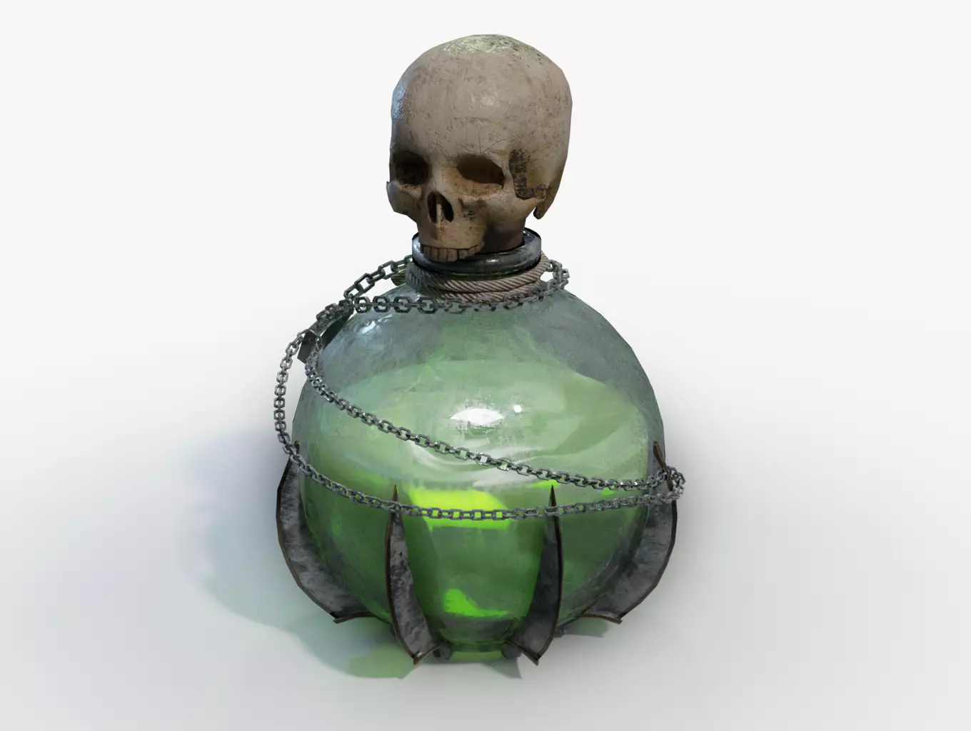 The model also uses a simple smoke material.Textures might be downsampled if needed.I made a model of a bottle with poison for my game, I use the model itself in the unit, but the detailing also allows us to make a high quality render for a preview if necessary. The color of the poison and the color of the smoke can be changed as needed. The poison can also be disabled to render an empty bottle.