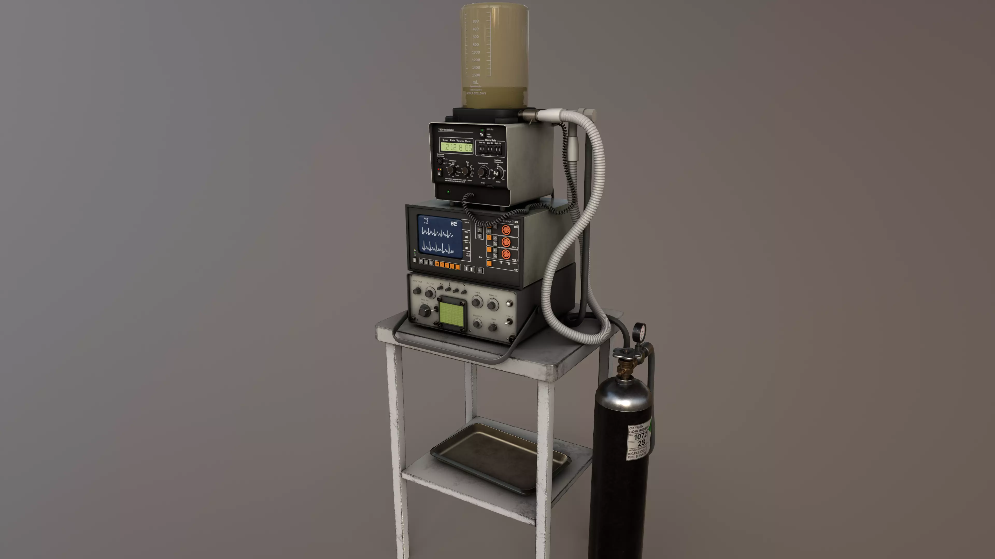 Classic medical ventilator 7800 Ventilator, accompanied by an ECG monitor 1732A. Ideal for medical simulation projects, historical visualizations or retro hospital environments.High-quality 4K textures, optimized UV mapping, and clean geometry. Compatible with modern rendering engines. Perfect for film, video games, medical training, or vintage technology collections.